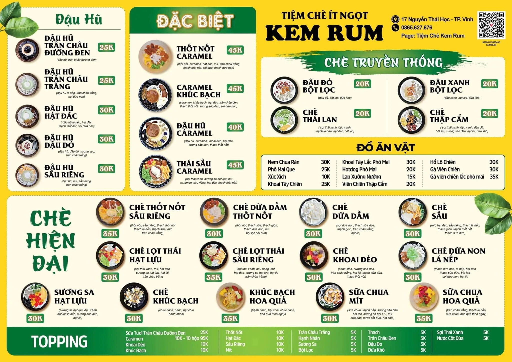 Với triết lý "ít ngọt" và một thực đơn đa dạng, Tiệm Chè Kem Rum mang đến một lựa chọn tráng miệng chất lượng. Sự chỉn chu trong không gian và hương vị thanh mát của các món chè là những yếu tố chính làm nên sức hút của quán.