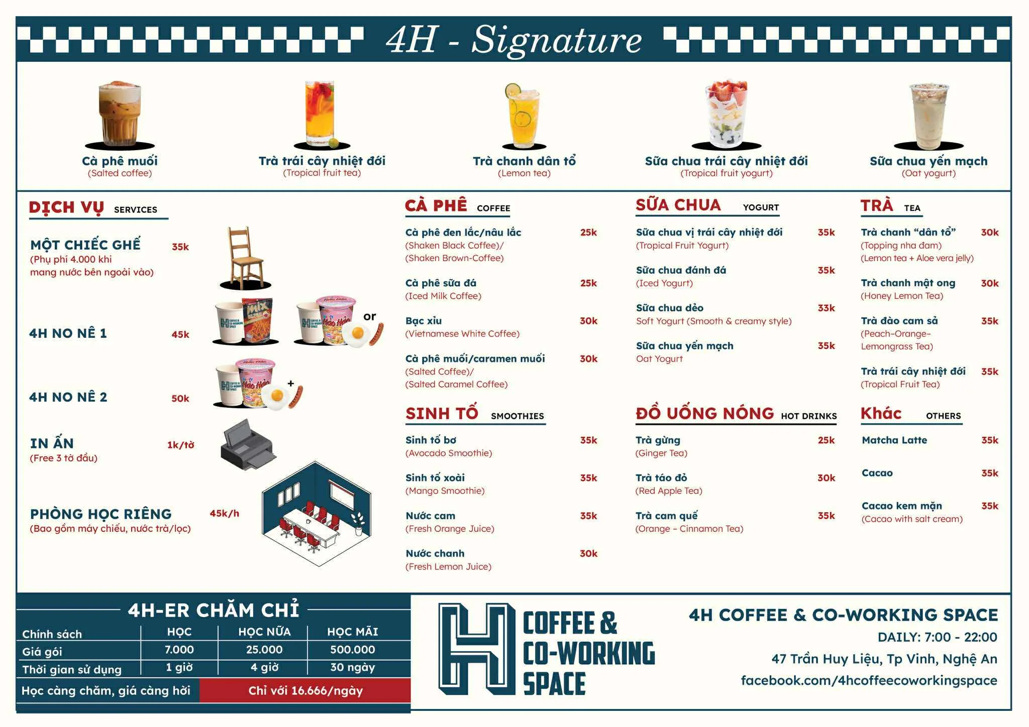 4H Coffee & CoWorking Space là một không gian kết hợp giữa quán cà phê và nơi làm việc chung, hướng đến việc tạo ra một môi trường lý tưởng để học tập, làm việc và sáng tạo. Với không gian ấm cúng và đầy đủ tiện nghi, quán mong muốn trở thành điểm đến quen thuộc cho những ai tìm kiếm sự tập trung, yên tĩnh hoặc cần một nơi để trao đổi nhóm.