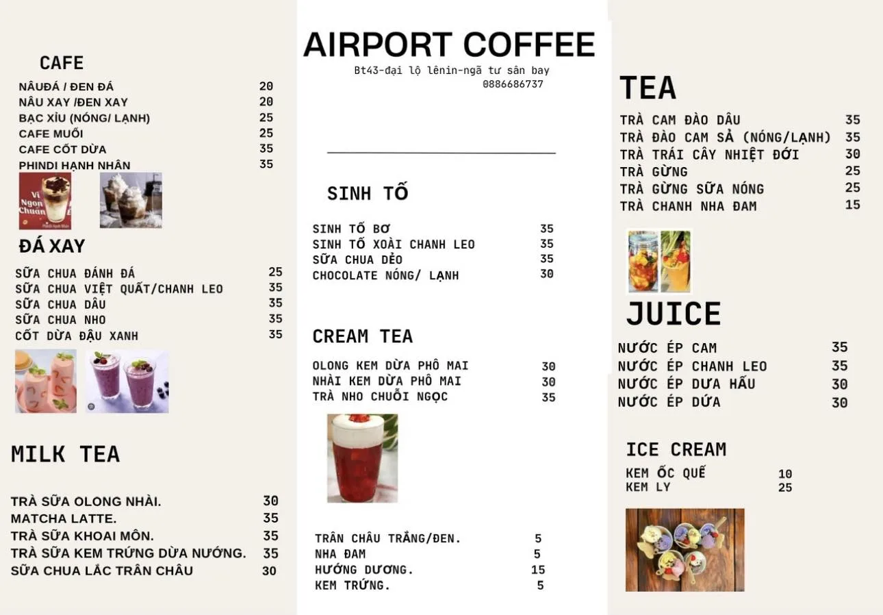 Airport Coffee là một quán cà phê nằm gần sân bay Vinh, nổi bật với không gian thoải mái, sang trọng và thoáng đãng, là lựa chọn lý tưởng cho khách du lịch và người dân địa phương. Quán phục vụ đa dạng các loại đồ uống và cả một số món ăn nhẹ, phù hợp cho những ai muốn thư giãn hoặc chờ đợi giờ bay.