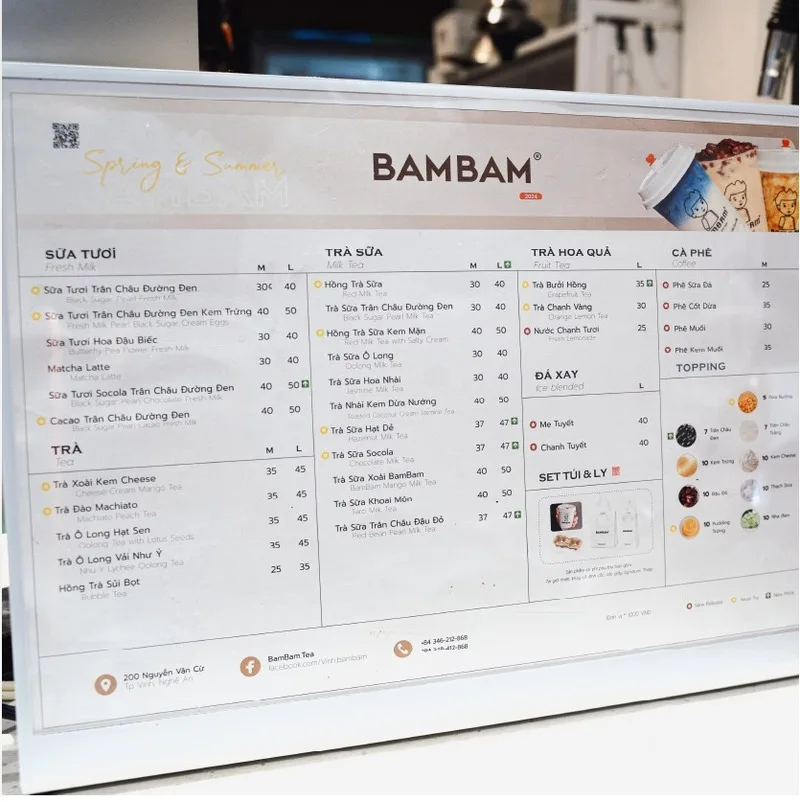 BamBam.tea là một local brand trà sữa từng "làm mưa làm gió" tại Vinh, nay đã có sự trở lại ấn tượng. Quán không chỉ giữ được chất lượng đồ uống "ngon, rẻ" mà còn được cộng điểm nhờ đội ngũ nhân viên "rất lễ phép và đáng yêu". Với không gian được trang trí xinh xắn và sự tinh tế của chủ quán, đây là điểm đến lý tưởng cho các bạn trẻ.