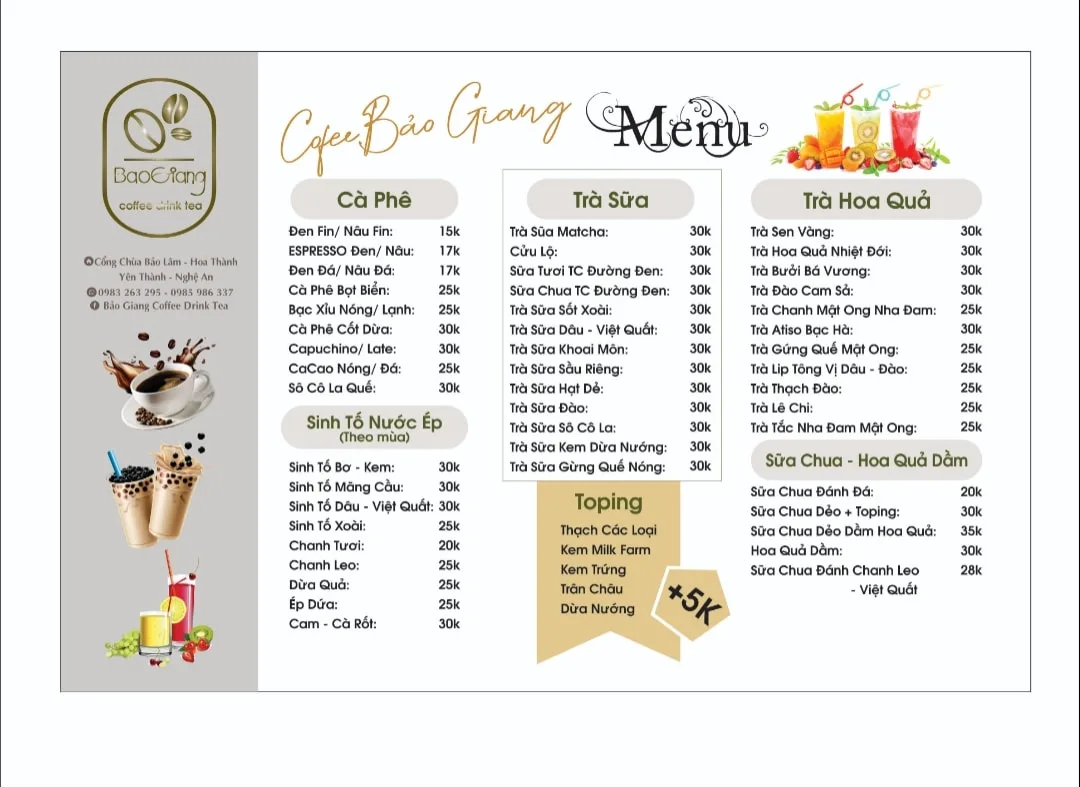 Bảo Giang Drinks Tea Coffee là một quán đồ uống địa phương phục vụ đa dạng các loại trà, cà phê và đồ uống giải khát khác. Nơi đây mang đến một lựa chọn bình dân, thoải mái cho người dân và du khách tại Yên Thành.