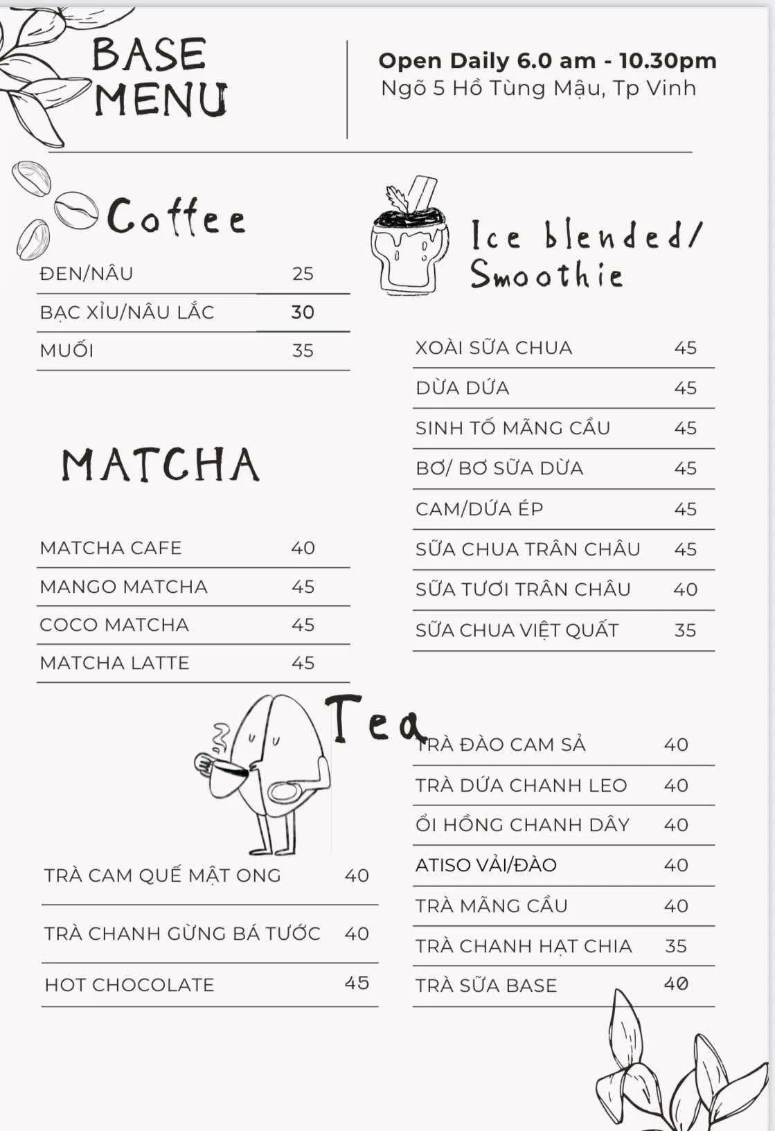 Base Coffee là một không gian cà phê ẩn mình trong con ngõ yên tĩnh, không gian xanh mát và hương cà phê thơm dịu, Base Coffee mang đến một chốn dừng chân bình yên, khoảnh khắc thư thái bên ly đồ uống yêu thích. Quán cũng là nơi diễn ra các buổi workshop, tiệc kỷ niệm hoặc đêm nhạc acoustic đầy cảm xúc