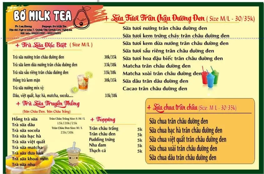 Bơ Milk Tea là một quán trà sữa tại Quỳnh Lưu, nổi tiếng với các loại đồ uống hấp dẫn. Với không gian đơn giản và giờ mở cửa linh hoạt, quán là lựa chọn phổ biến của những người yêu thích trà sữa trong khu vực.
