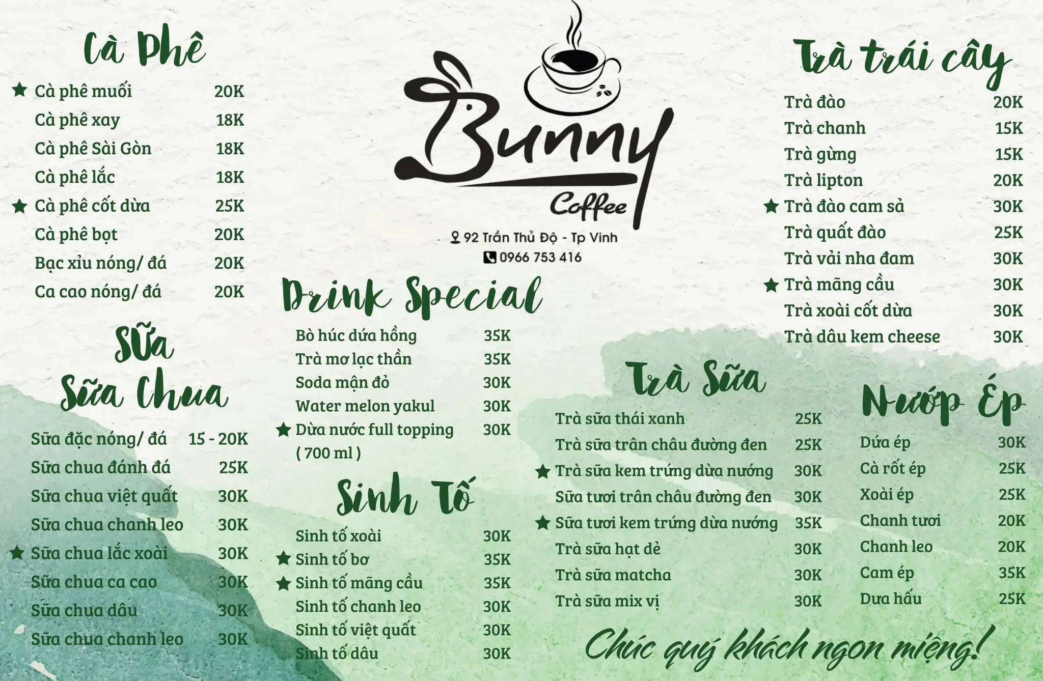 BUNNY Coffee là một tiệm đồ uống được yêu thích, nơi chất lượng được đặt lên hàng đầu. Quán gây ấn tượng với việc sử dụng các nguyên liệu chất lượng như sữa chua TH (thay vì bột) và các món "hot trend" được pha chế hợp khẩu vị. Đây là điểm đến lý tưởng để thưởng thức những ly đồ uống đầy đặn, ngon miệng với giá cả hợp lý.