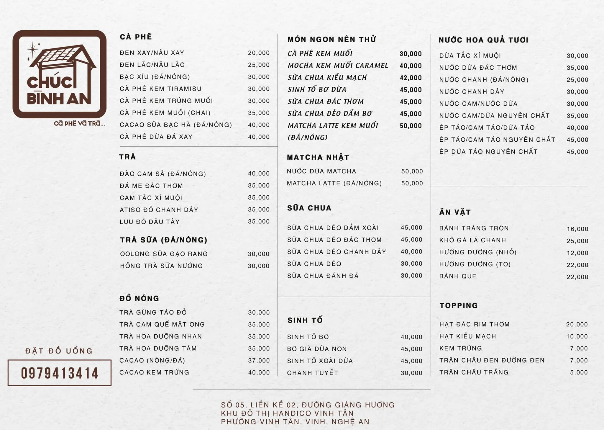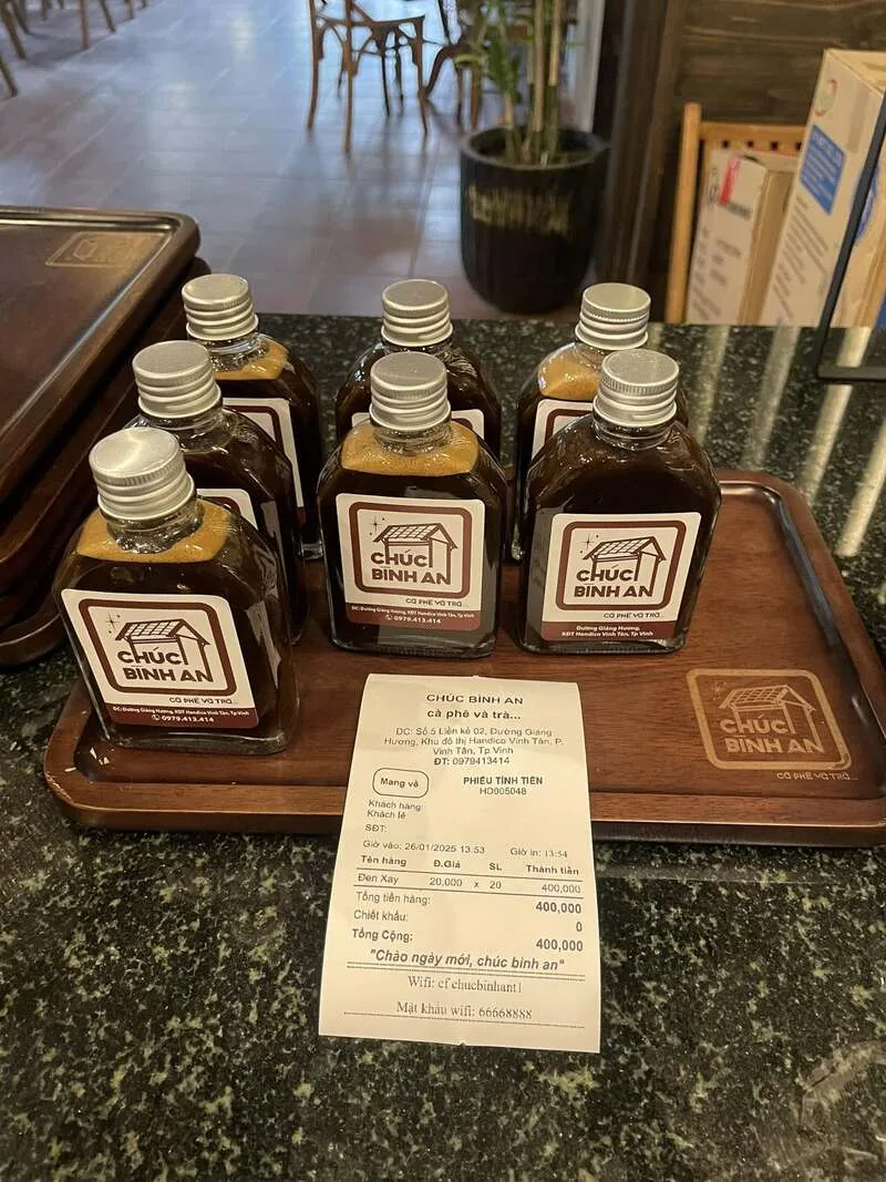 Chúc Bình An Cà phê và Trà là một quán cà phê và trà tại tọa lạc tại Khu đô thị Handico Vinh Tân. Quán được biết đến với không gian rộng rãi, thoáng mát và đồ uống ngon, là điểm đến lý tưởng để thư giãn, học tập hay gặp gỡ bạn bè