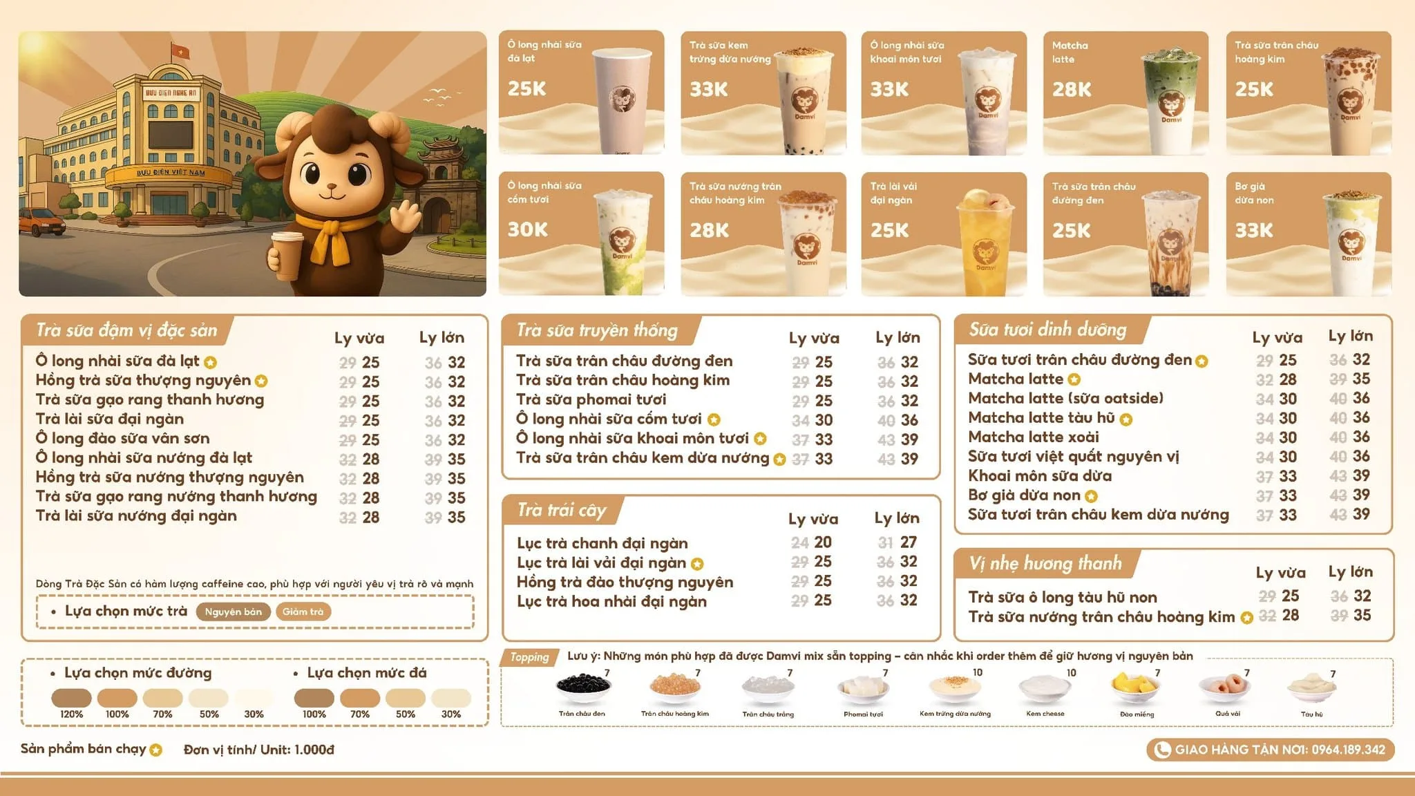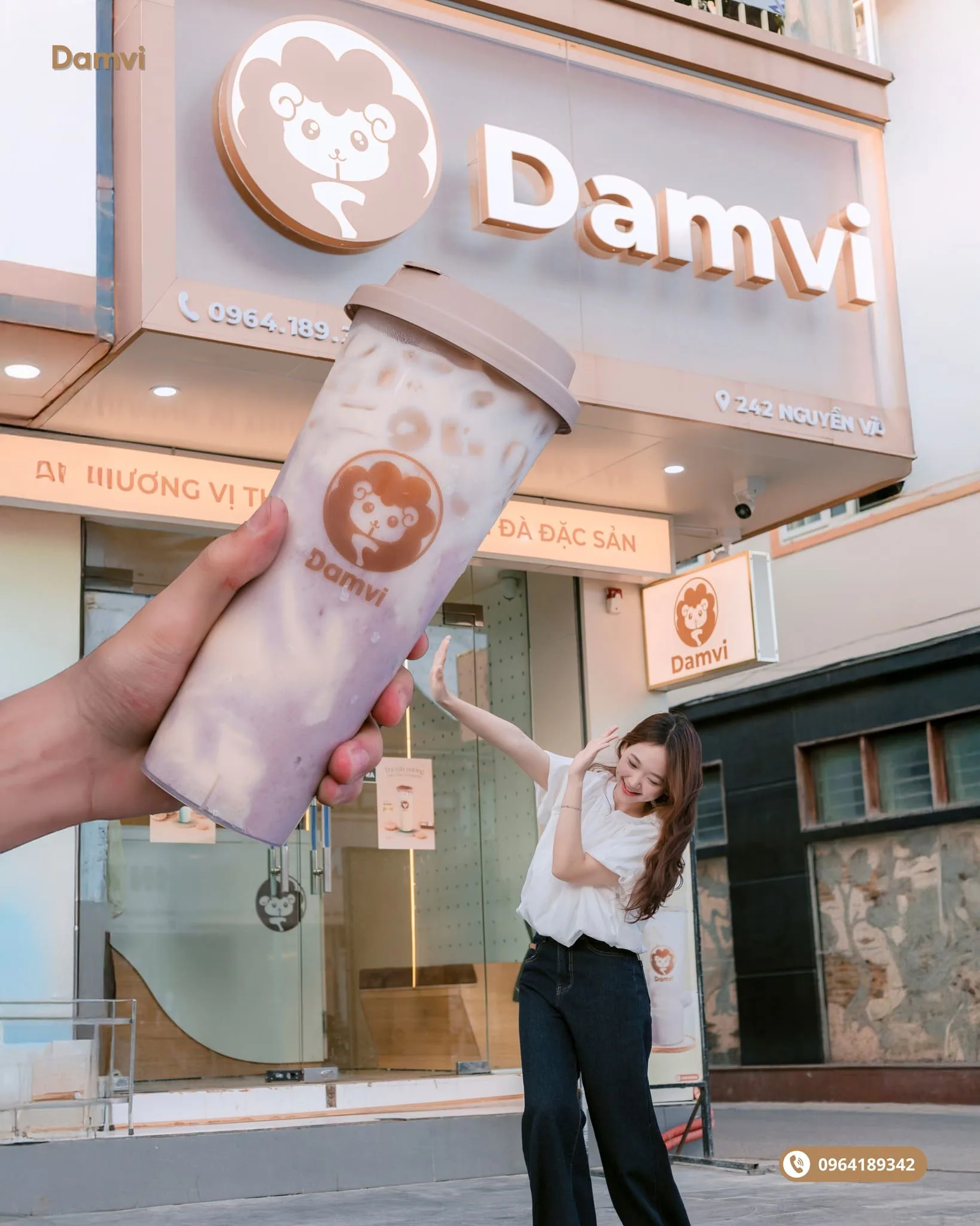Damvi là một thương hiệu trà sữa đặc sản có biểu tượng chú cừu dễ thương, tập trung tôn vinh tinh hoa từ 6 tuyệt phẩm trà Việt Nam. Quán chinh phục khách hàng bằng việc chú trọng vào chất lượng nguyên liệu cốt lõi, từ những búp trà xanh tươi nhất đến khoai môn được nghiền thủ công mỗi ngày, mang đến những ly trà sữa "đậm vị đặc sản" và chân thật.