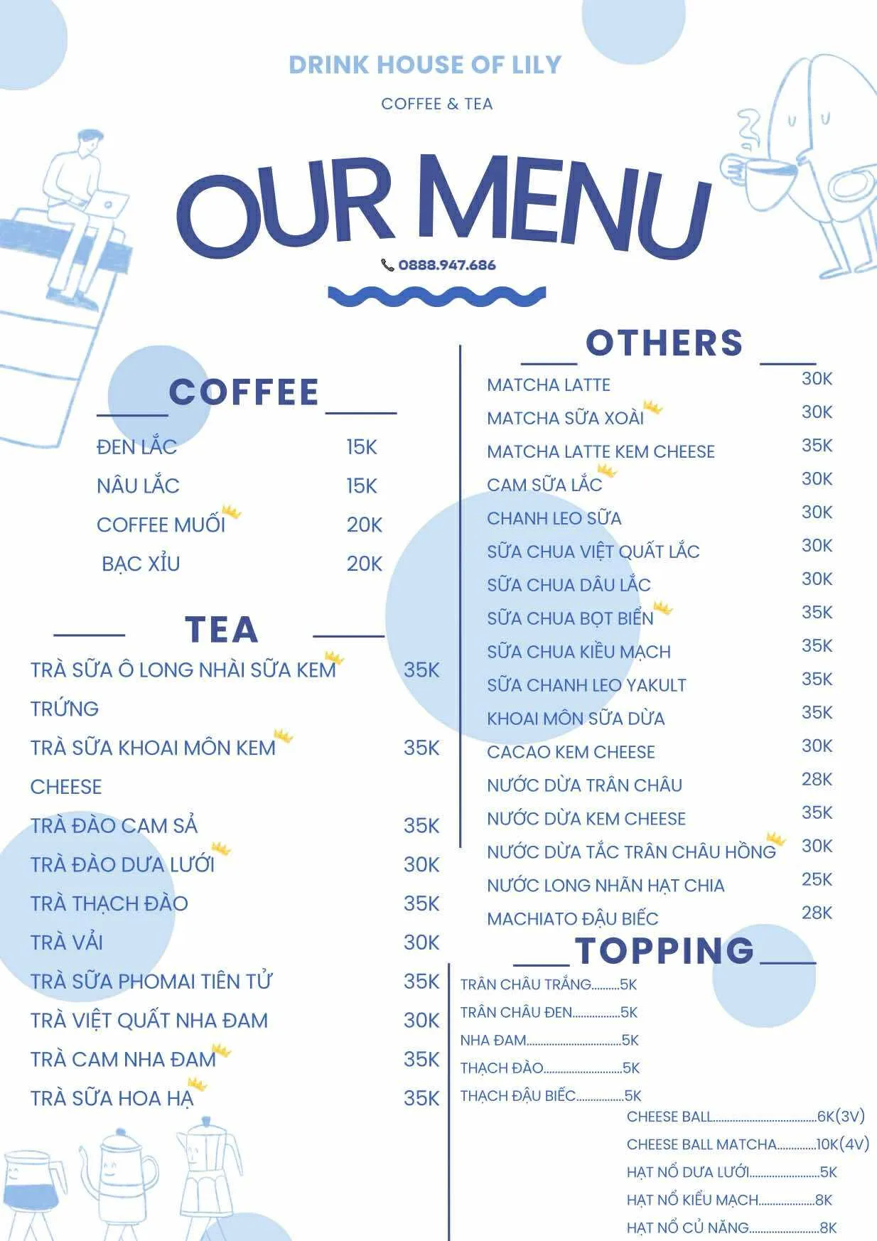 Drink house of Lily là một tiệm trà sữa chuyên bán mang đi (take-away), tọa lạc tại ngõ 86 Nguyễn Tiềm. Quán không chỉ có menu đồ uống phong phú mà còn rất sáng tạo trong việc cung cấp các set quà tặng kết hợp giữa hoa và trà sữa vào các dịp lễ như Trung Thu, mang đến những lựa chọn xinh xắn và ý nghĩa.