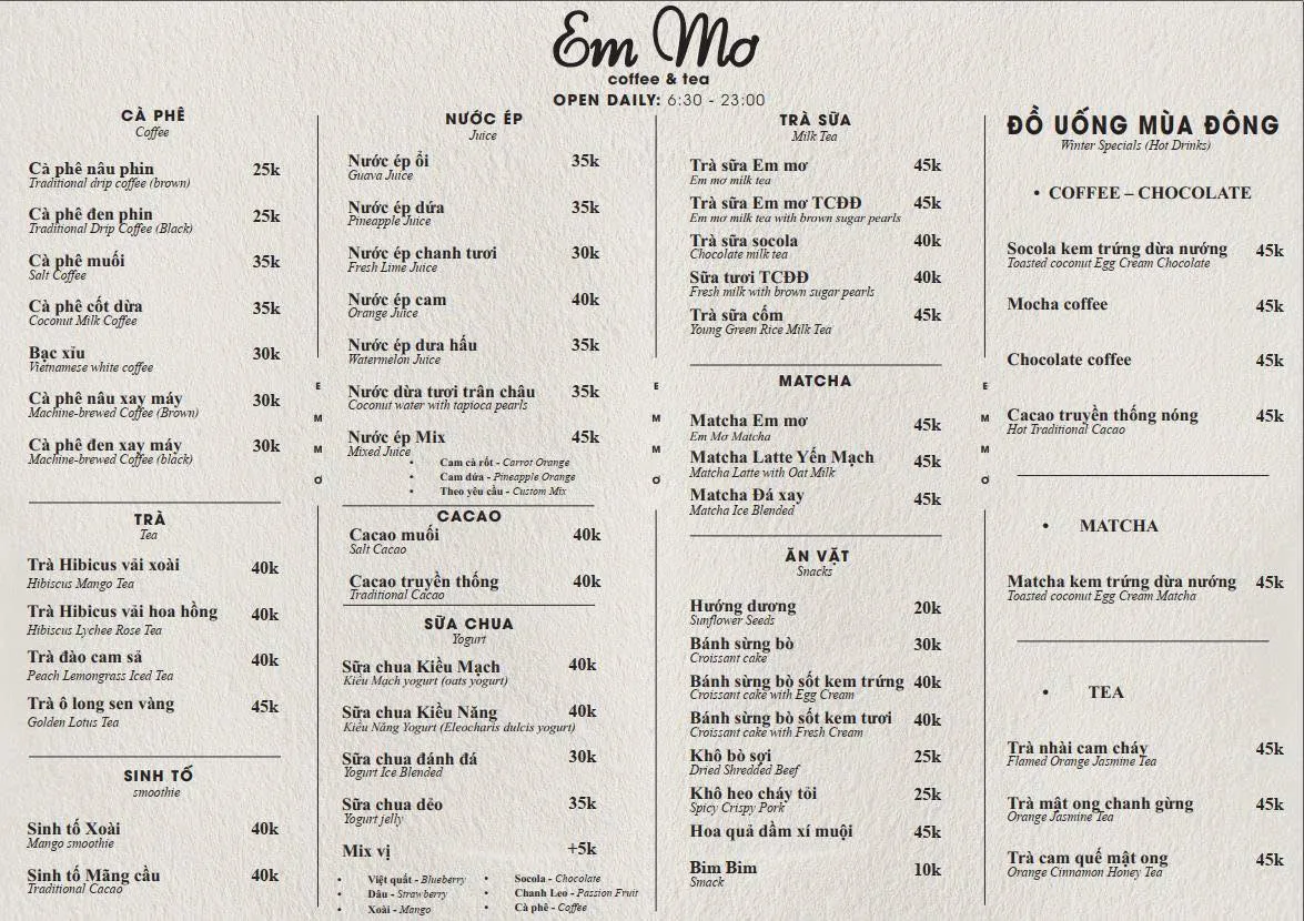 Em Mơ Coffee là điểm đến lý tưởng cho những ai tìm kiếm một không gian "chill" để tổ chức sinh nhật hoặc check-in theo mùa. Quán rất được lòng khách hàng nhờ việc luôn trang trí chỉn chu cho các ngày lễ (Noel, Trung Thu...) và đặc biệt là hỗ trợ làm bảng "Chúc mừng sinh nhật" miễn phí. Với không gian đẹp, đồ uống ngon và nhân viên nhiệt tình, Em Mơ là một sự lựa chọn hợp lý cho các buổi tụ tập.
