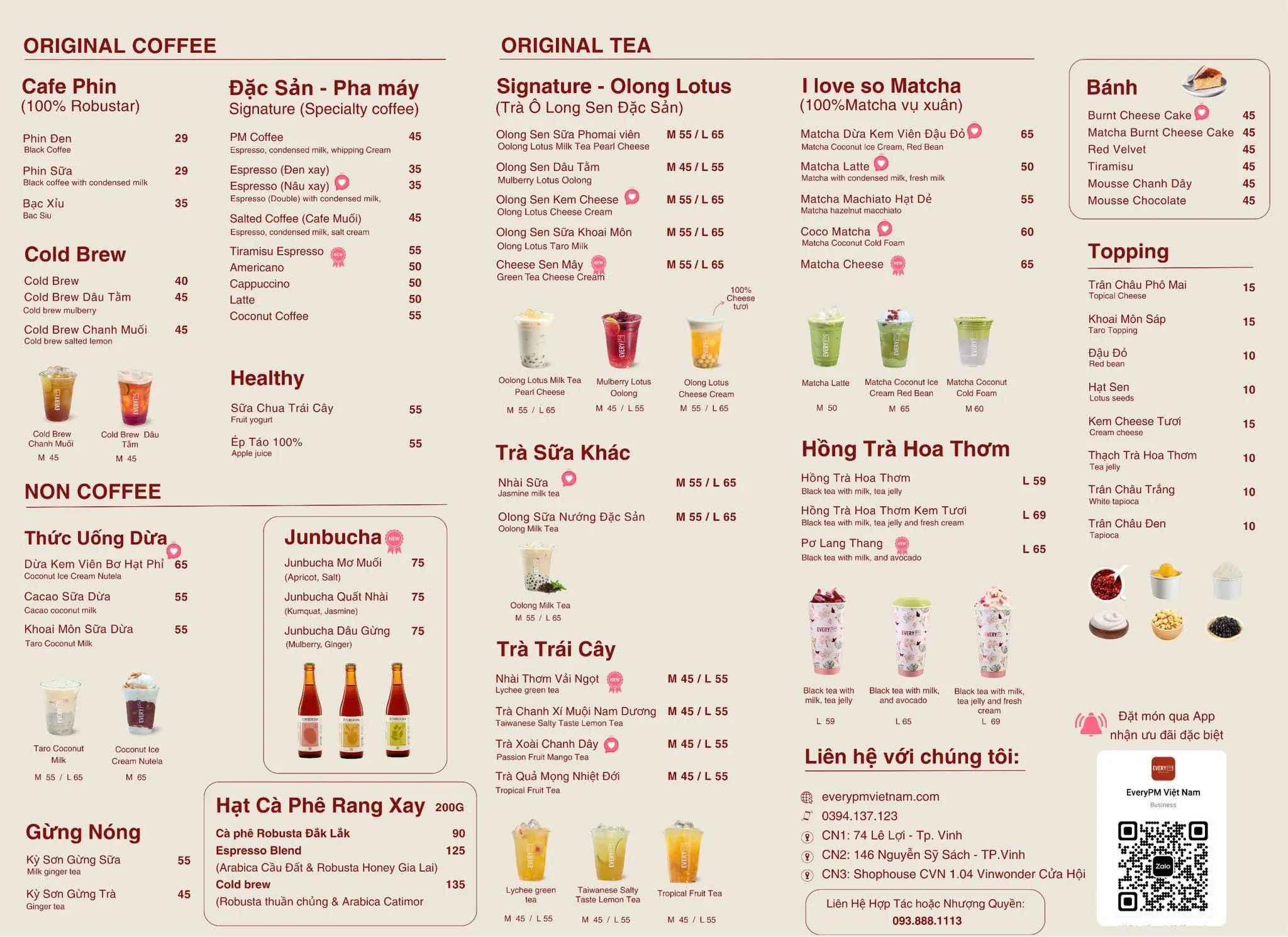 Every PM là một thương hiệu cà phê tạo được dấu ấn mạnh mẽ tại Vinh. Dù nằm cạnh các "ông lớn", quán không hề lép vế nhờ không gian sang trọng, đồ uống chất lượng và đặc biệt là đội ngũ nhân viên thân thiện, luôn chào hỏi và phục vụ nhẹ nhàng, tinh tế. Quán cũng có ứng dụng giao hàng riêng, hoạt động nhanh chóng và thường xuyên có các chương trình khuyến mãi hấp dẫn.