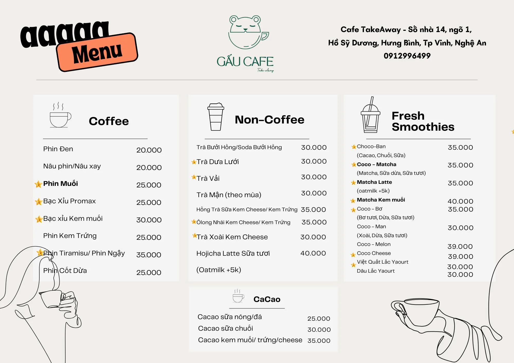 Gấu Cafe Take Away là địa điểm lý tưởng cho những ai muốn thưởng thức Matcha và Cafe một cách nhanh chóng và tiện lợi. Với sự tâm huyết dành cho các loại đồ uống, đặc biệt là matcha và cà phê, Gấu Cafe Take Away mang đến những thức uống chất lượng cao, phù hợp với nhịp sống bận rộn