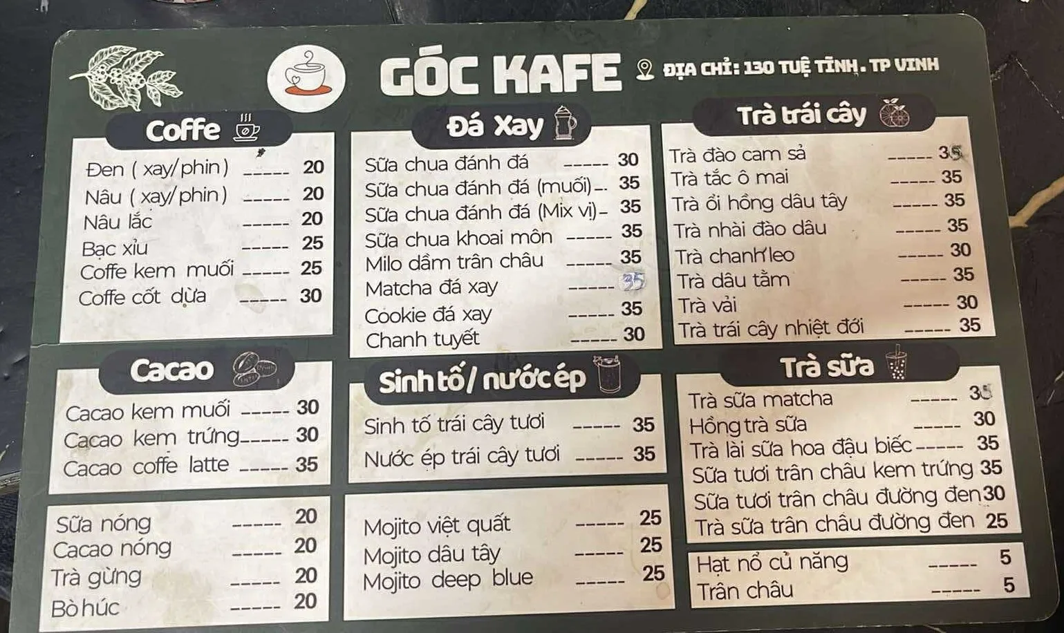 Góc Kafe (hoặc Góc Tĩnh Kafe) tại địa chỉ 130 Tuệ Tĩnh, là một quán cà phê được đánh giá cao về sự yên tĩnh, không gian thoáng mát và chất lượng đồ uống tuyệt vời. Quán là địa điểm lý tưởng cho những ai muốn tìm một nơi để tập trung làm việc, học tập hoặc thư giãn trong không gian ấm cúng.