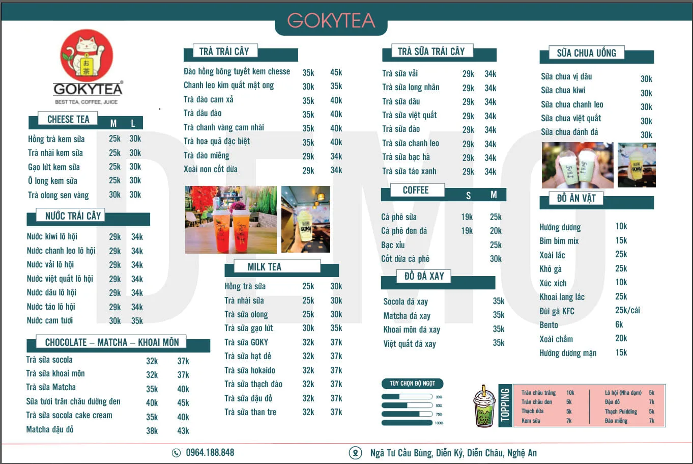 Goky Tea là cơ sở Trà sữa Goky đầu tiên ở Nghệ An được khai trương vào 20/09/2017 ở khu vực ngã ba cầu Bùng, Diễn Kỷ cũ. Với menu đa dạng và phong cách phục vụ trẻ trung, quán là điểm đến quen thuộc của giới trẻ trong khu vực.