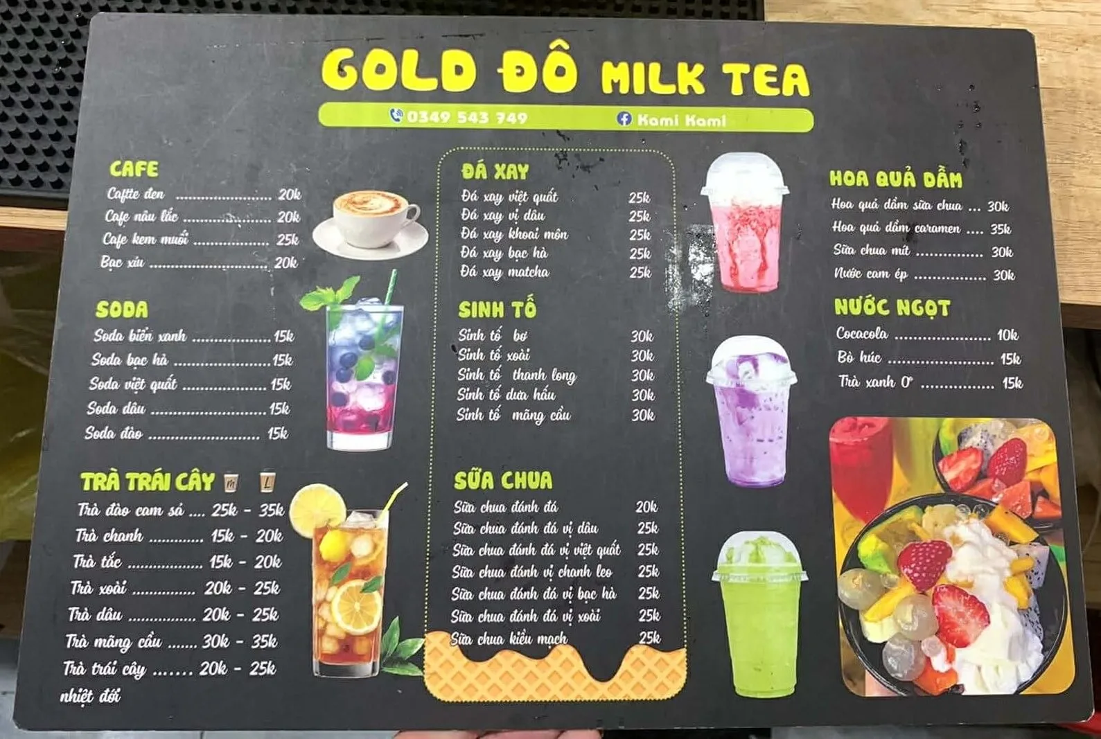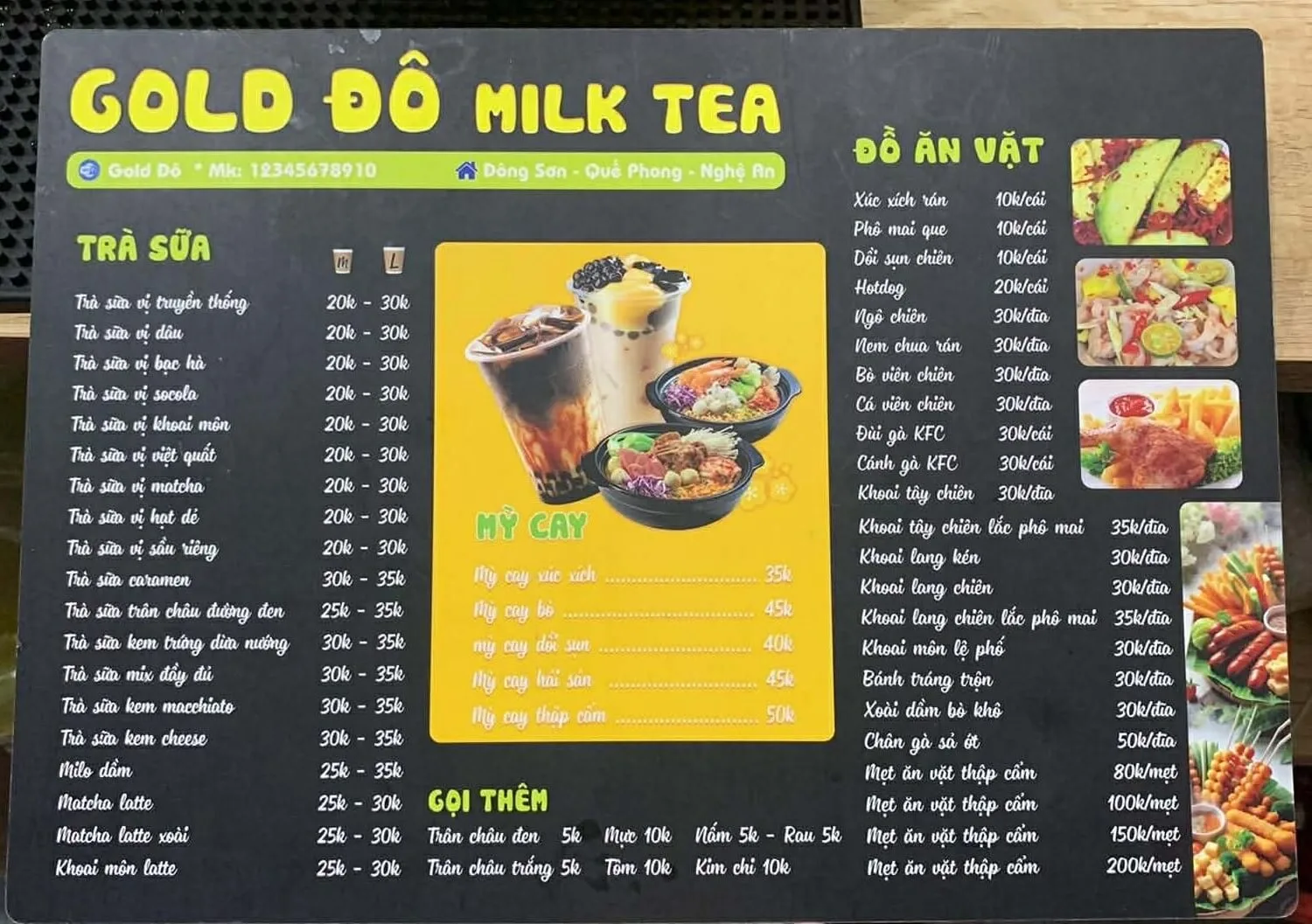 GOLD Đô Milk Tea là quán trà sữa, cà phê và đồ ăn vặt phục vụ tại địa phương Quế Phong, mang đến nhiều loại thức uống và món ăn vặt phù hợp với khẩu vị đa dạng của khách hàng.