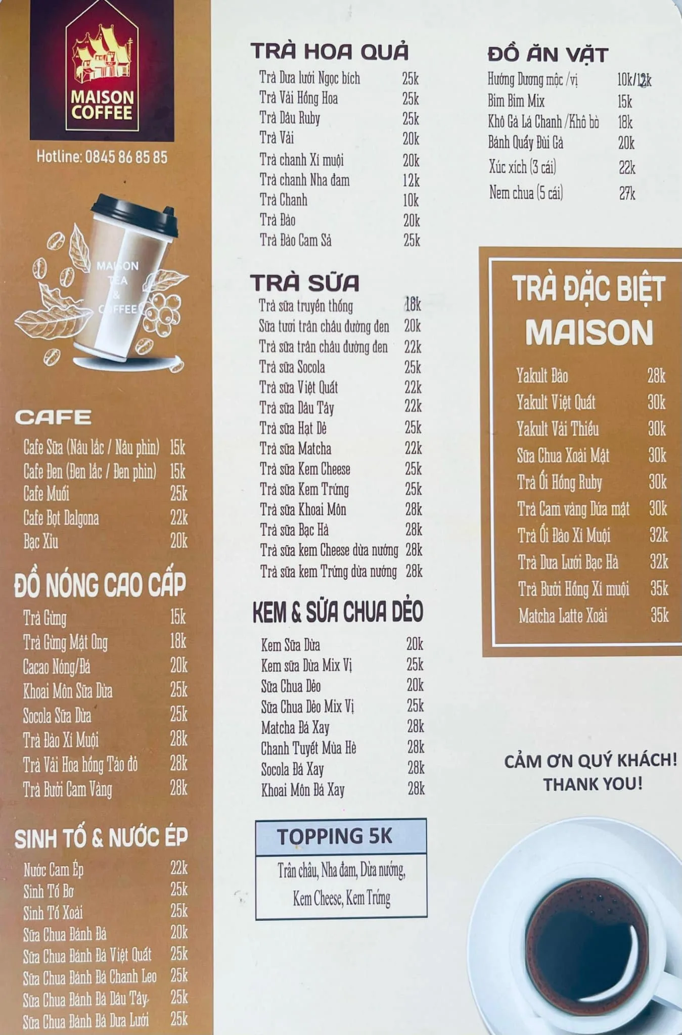 Maison Coffee là một quán cà phê được biết đến với không gian xanh mát, là sự giao thoa giữa nét truyền thống và hiện đại. Nơi đây mang đến một điểm hẹn lý tưởng để thư giãn, tận hưởng không khí trong lành và thưởng thức đồ uống trong một không gian ấm cúng, có view đẹp