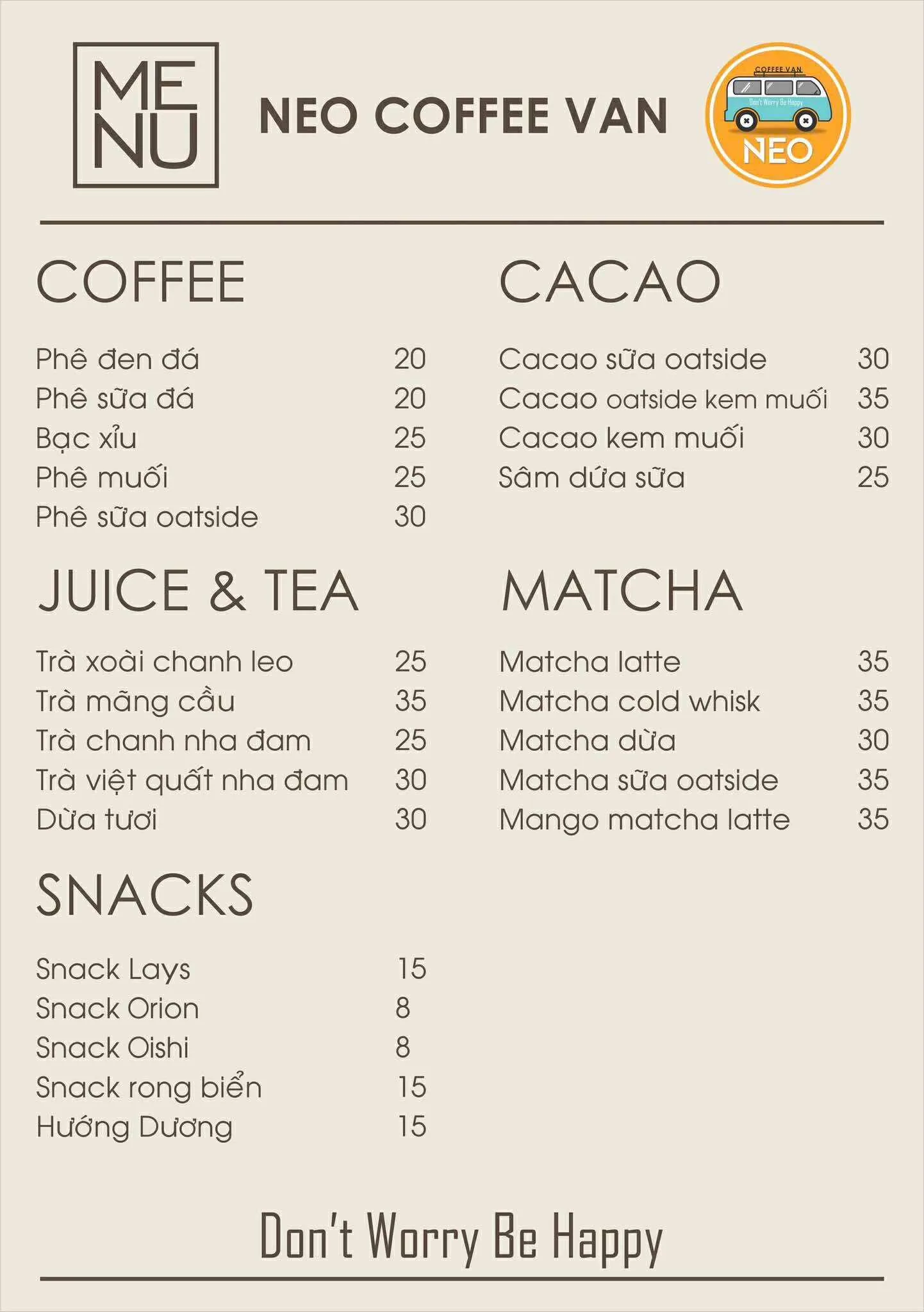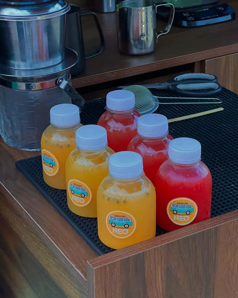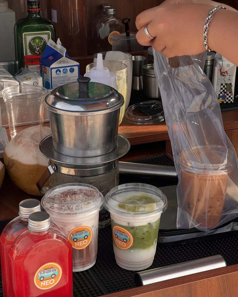 Neo Coffee Van là một mô hình quán cà phê di động (coffee van) độc đáo và xinh xắn. Với chiếc xe van trắng - xanh ngọc nổi bật đỗ bên bờ hồ điều hòa, Neo mang đến một không gian "chill", gần gũi thiên nhiên, nơi khách hàng có thể nhâm nhi cà phê, ngắm hoàng hôn và tận hưởng âm nhạc nhẹ nhàng. Slogan của quán là "Don't worry be happy"