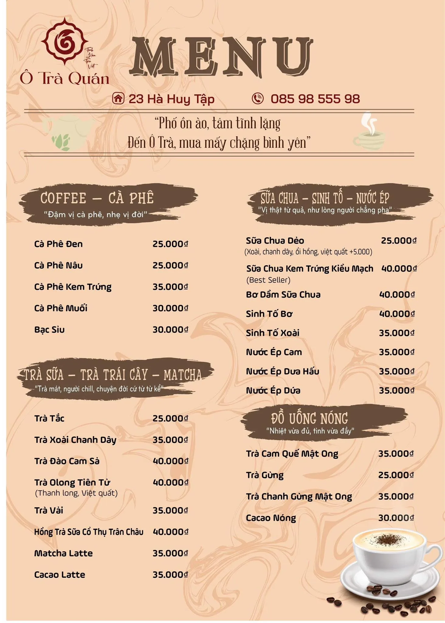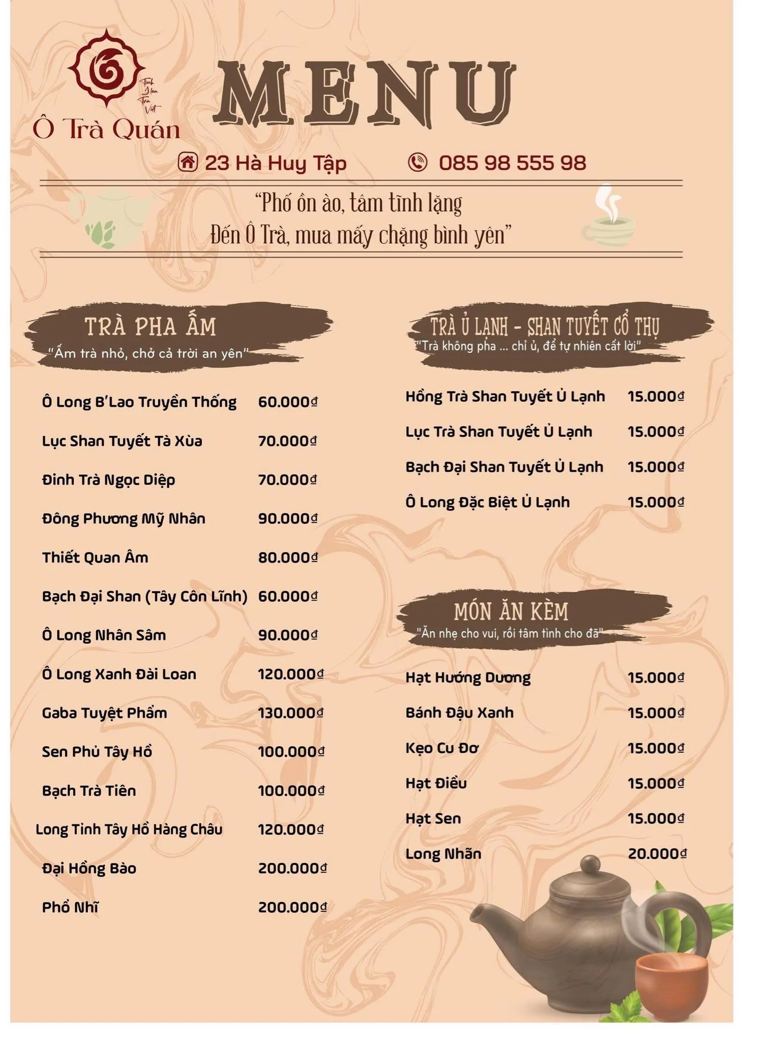 Ô Trà Quán là một quán trà đạo với không gian yên bình và thanh nhã giữa lòng thành phố. Đinh hướng "Tinh Hoa Trà Việt", quán tập trung vào các dòng trà truyền thống, trà thảo mộc và trà hoa, tạo nên một nơi lý tưởng để thư giãn và thưởng thức trà đạo