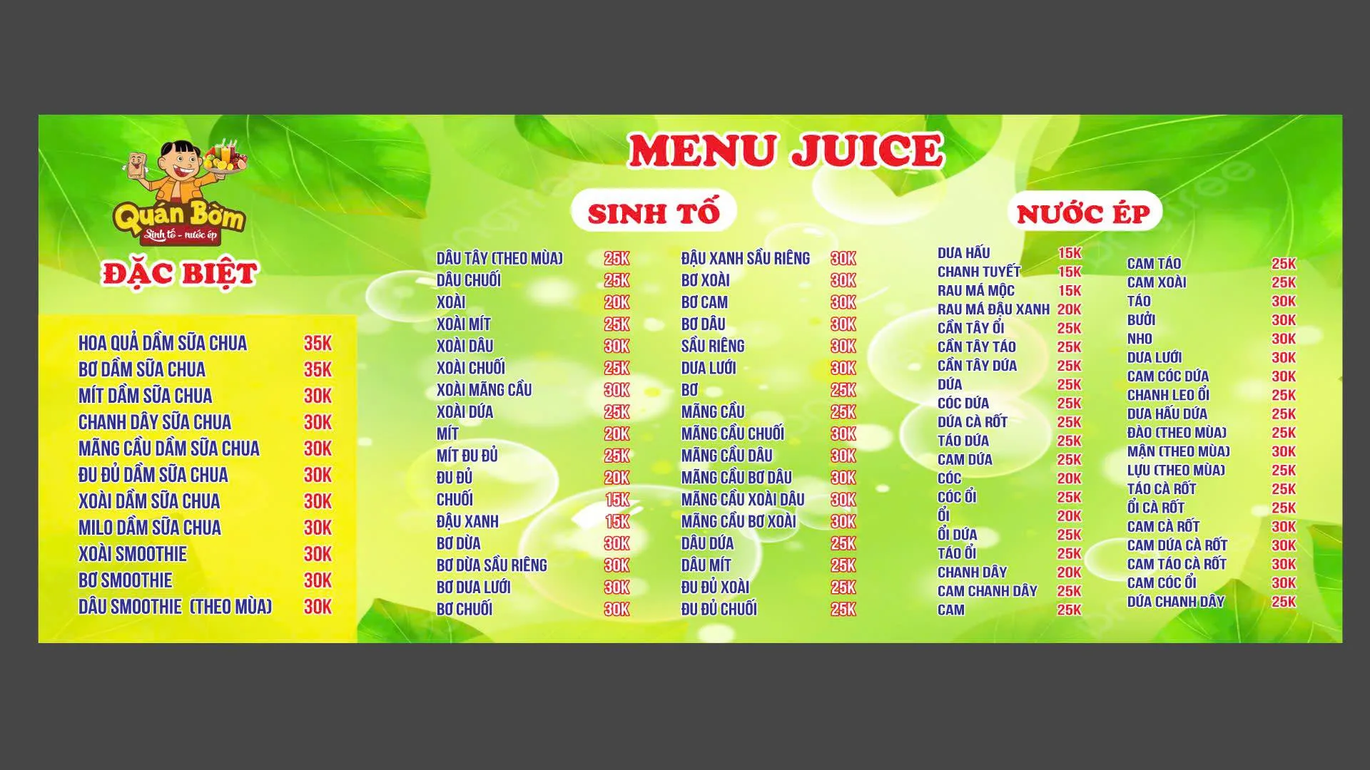 Quán Bờm - Nước ép Sinh tố là một địa điểm chuyên về đồ uống giải khát, các loại nước ép sinh tốt và hoa quả dầm. Với nguyên liệu tuyển chọn, trái cây tươi trong ngày, đảm bảo chất lượng đồ uống thơm ngon bổ dưỡng