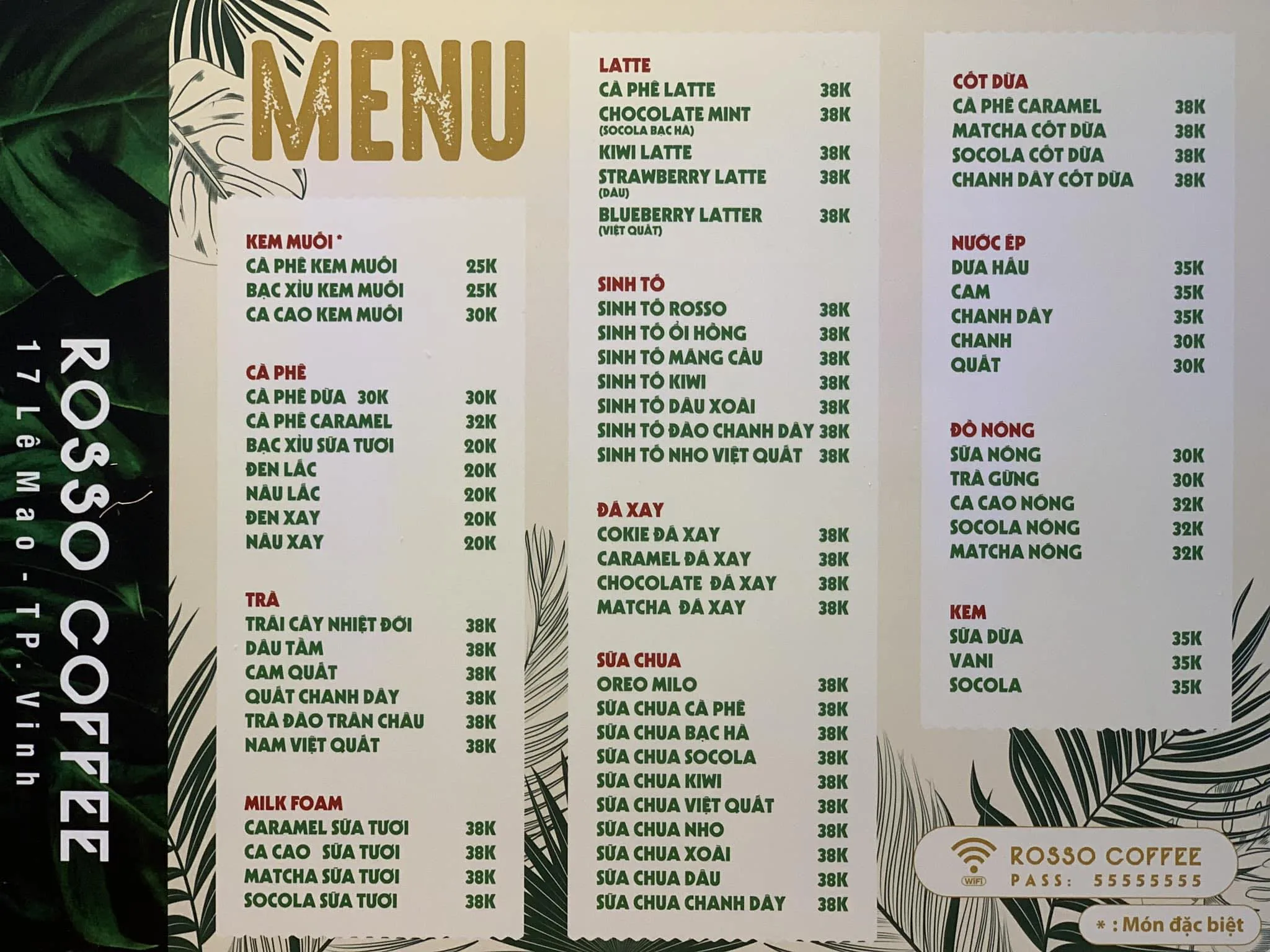 Rosso Coffee là một chuỗi quán cà phê tại thành phố Vinh, Nghệ An, với các chi nhánh tọa lạc ở những vị trí trung tâm, thuận tiện cho việc di chuyển. Quán được biết đến với không gian hiện đại, yên tĩnh và đồ uống đa dạng, phù hợp để làm việc, thư giãn hoặc tụ tập bạn bè.