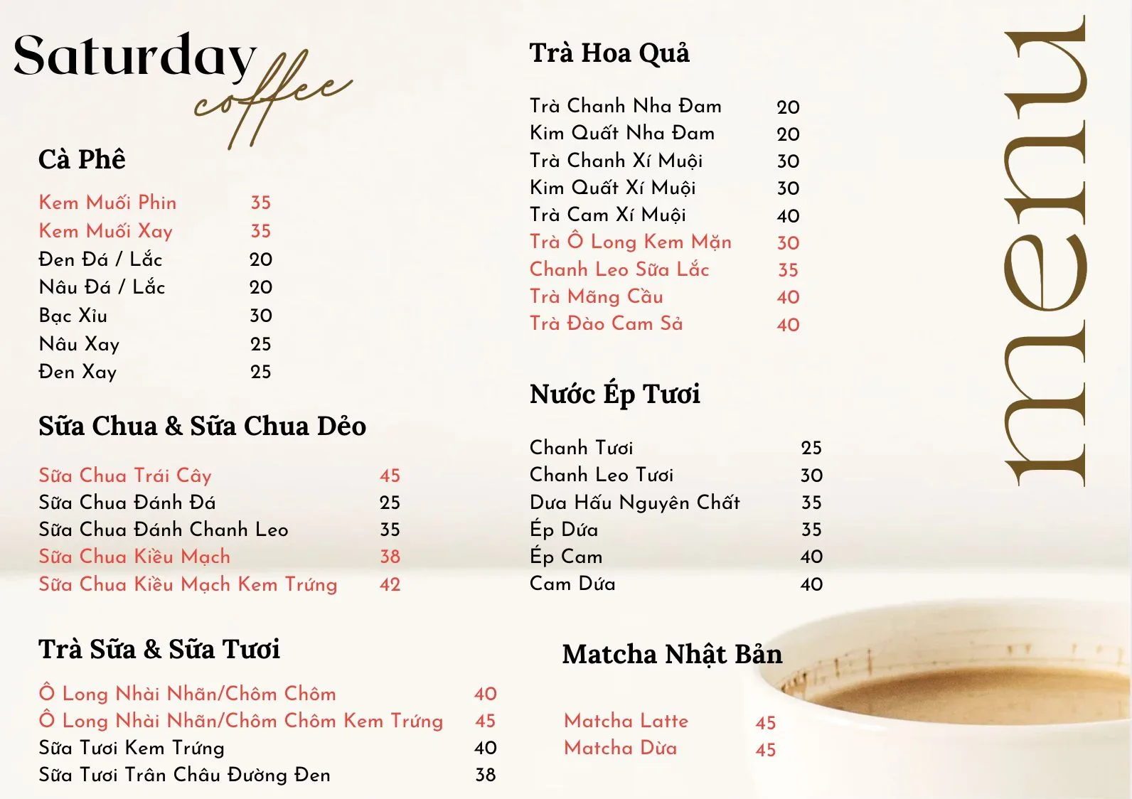 Saturday Coffee & Tea là một quán cà phê sân vườn lý tưởng cho những ai đang tìm một chốn yên tĩnh, thoáng đãng và ngập tràn cây xanh. Với phong cách nhẹ nhàng, một chút hoài cổ như "Đà Lạt thu nhỏ", đây là nơi hoàn hảo để thư giãn, làm việc hay gặp gỡ bạn bè trong một không gian không quá ồn ào.