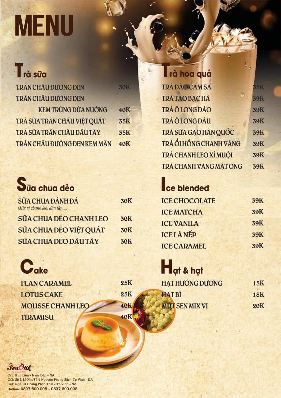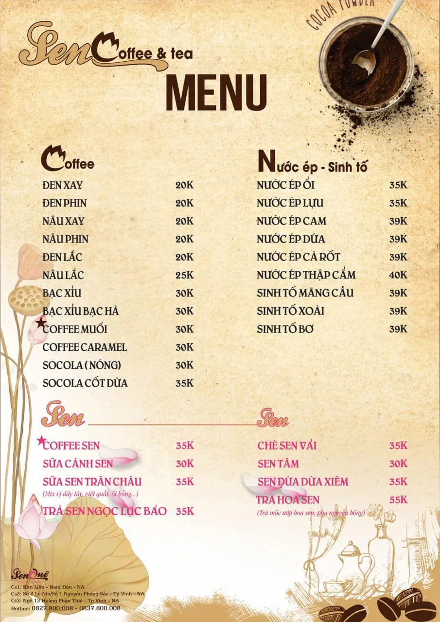 Sen Coffee & Tea là một quán cà phê và trà tại thành phố Vinh cũ, được biết đến với không gian thoải mái, mát mẻ. Đây là địa điểm lý tưởng để thưởng thức đồ uống ngon và thư giãn, với vị trí thuận lợi ngay trên đại lộ Lê Nin. Quán cũng có mối liên hệ với chuỗi nhà hàng Sen Quê tại Nghệ An.