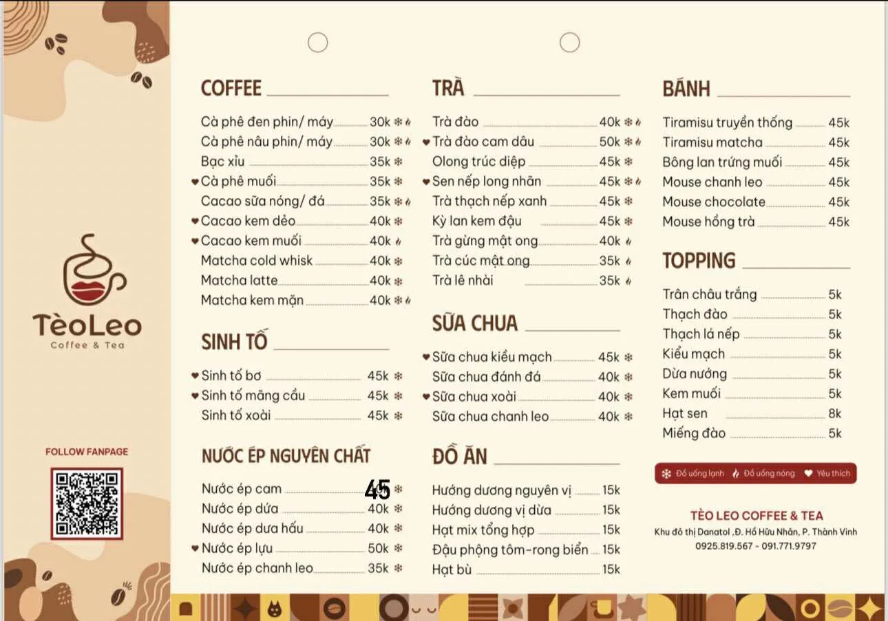 TÈO LEO Coffee & Tea là một quán cà phê tại phường Vinh Tân, thành phố Vinh, Nghệ An. Quán được biết đến với không gian thoải mái, mát mẻ và đồ uống đa dạng, là điểm đến lý tưởng để thư giãn, làm việc hoặc tụ tập cùng bạn bè.