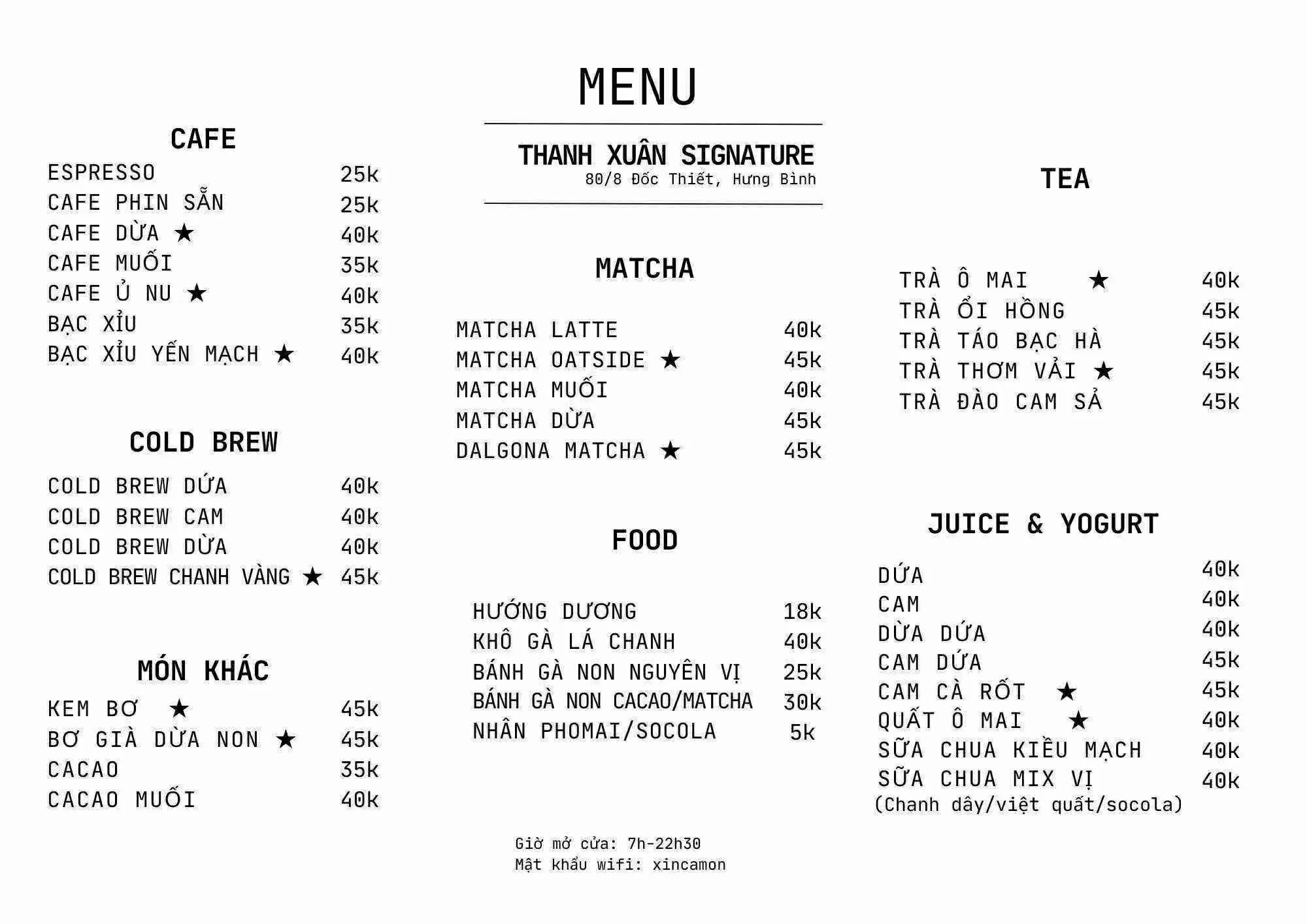 Thanh Xuân Signature Cafe là một chốn chill đúng nghĩa, mang đến một không gian hoài niệm và ấm cúng giữa lòng thành Vinh. Quán là điểm đến yêu thích cho những ai tìm kiếm một không gian đẹp để check-in, thư giãn. Quán đặc biệt được yêu thích nhờ đội ngũ nhân viên tinh tế, nhiệt tình, luôn sẵn sàng hỗ trợ khách hàng.