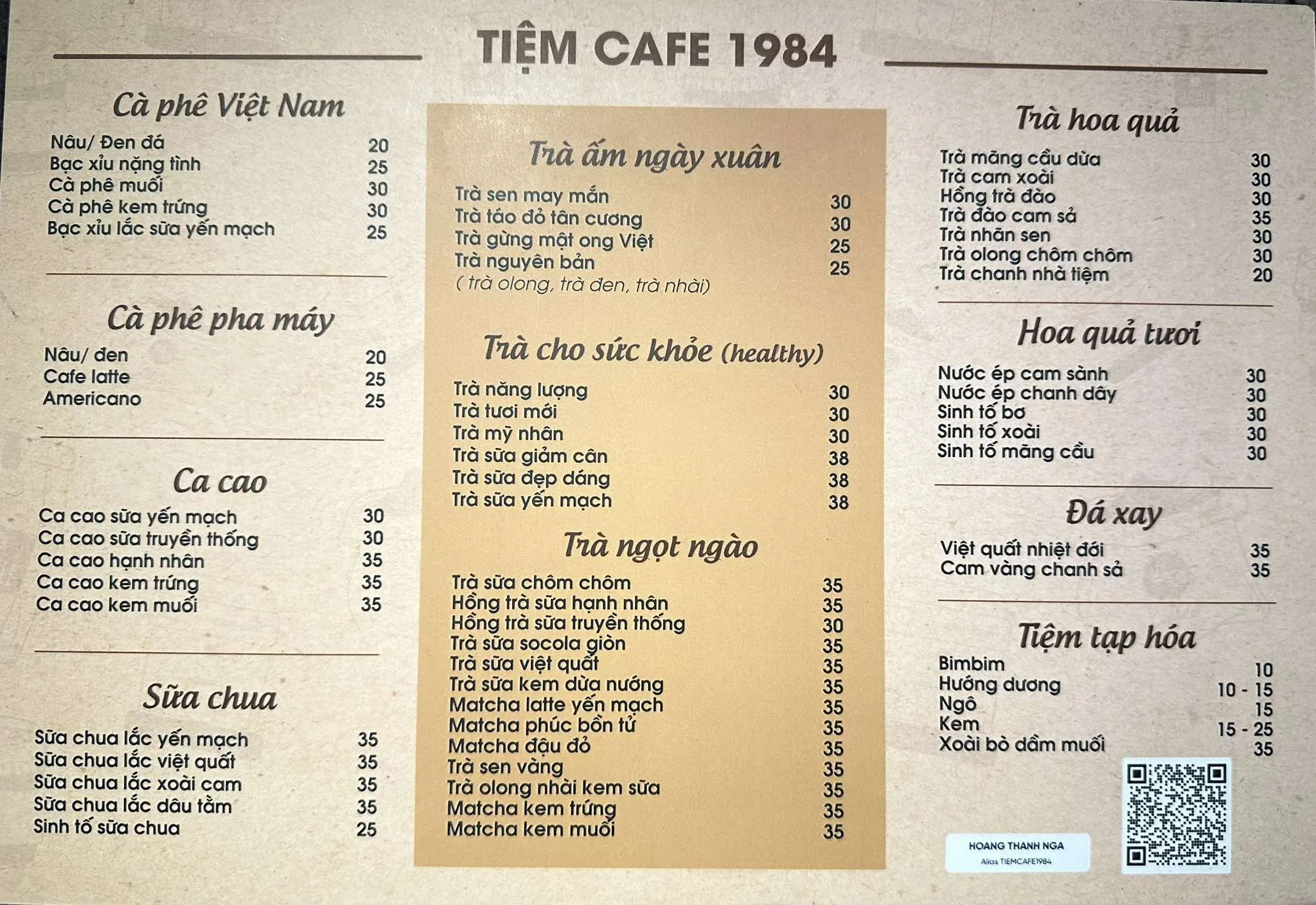 Tiệm Cafe 1984 là một quán cà phê quen thuộc tại thị xã Hoàng Mai cũ. Quán được nhiều khách hàng yêu thích nhờ không gian ấm cúng, đồ uống đa dạng và giá cả phải chăng, là điểm hẹn lý tưởng để thưởng thức cà phê và trò chuyện cùng bạn bè