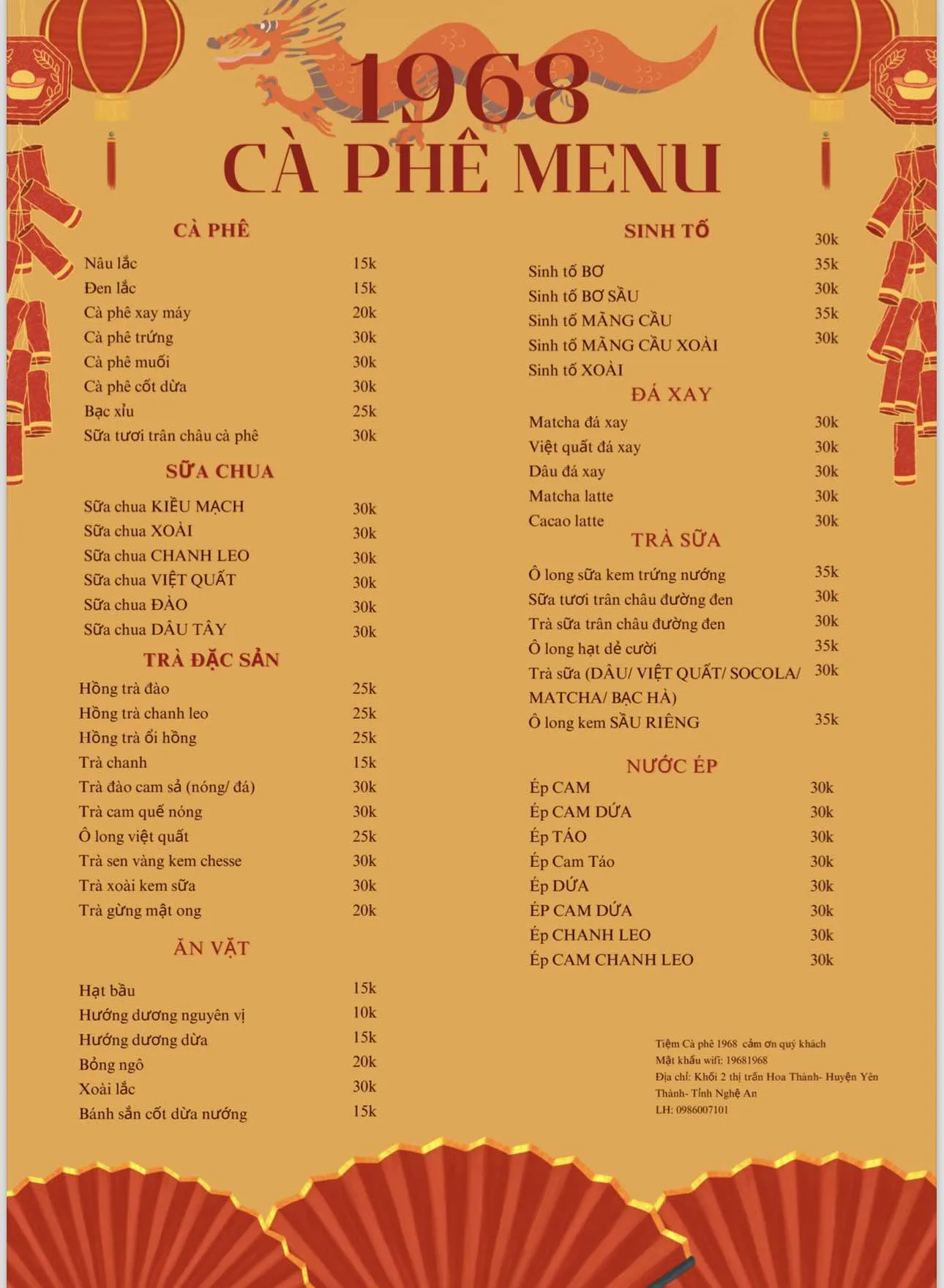 Tiệm Coffee 1968 là một quán cà phê mang phong cách vintage, tái hiện không gian cổ kính của những năm 60 tại thị trấn Yên Thành. Với cà phê rang xay đậm vị và menu đồ uống đa dạng, quán là điểm đến lý tưởng cho những ai muốn tìm một nơi yên tĩnh, hoài niệm và thưởng thức đồ uống ngon