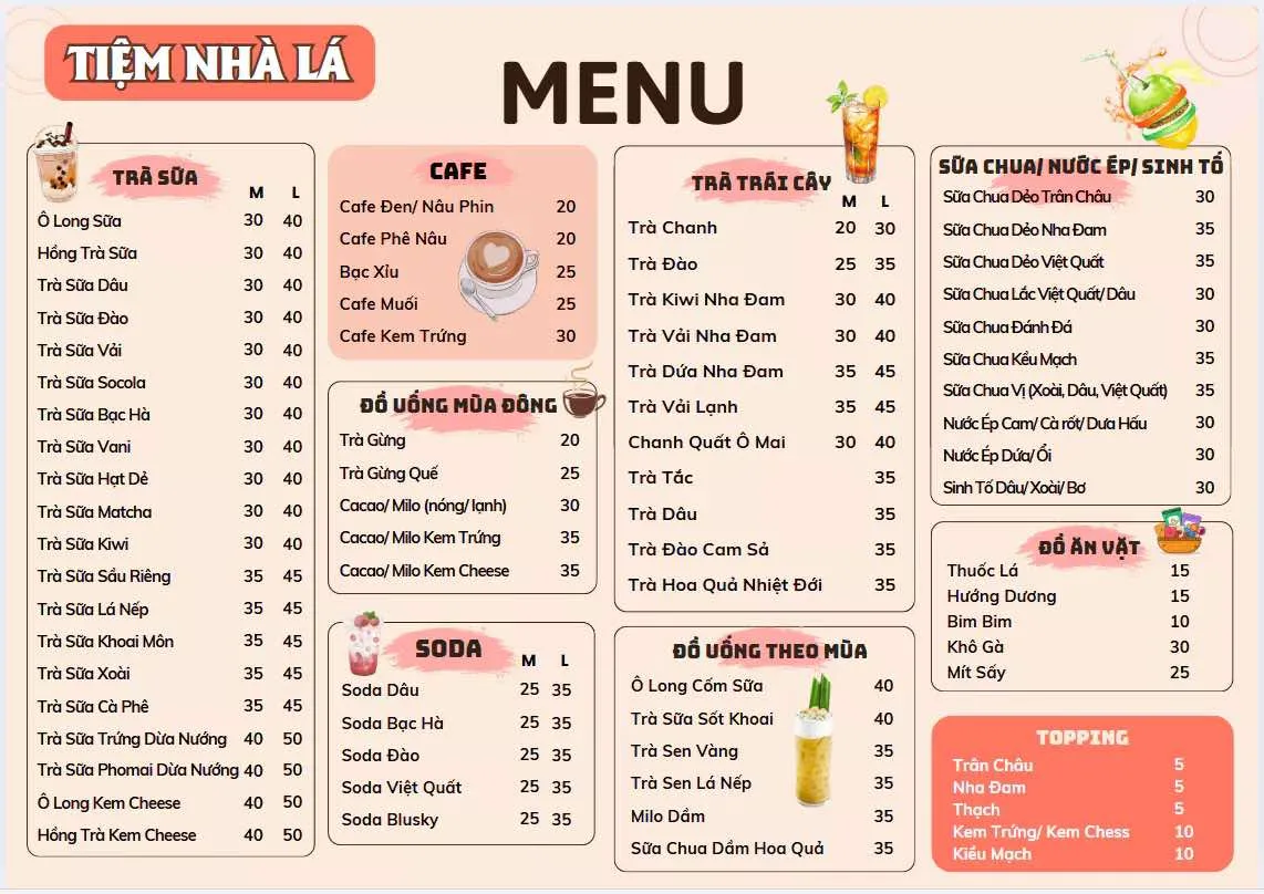 Tiệm Nhà Lá Coffee & Milk Tea tại 25 Đinh Văn Chất là một quán cà phê và trà sữa nổi bật ở thị xã Thái Hòa, Nghệ An. Quán gây ấn tượng với không gian thoáng đãng, thiết kế đẹp mắt, là điểm đến lý tưởng để thư giãn và check-in