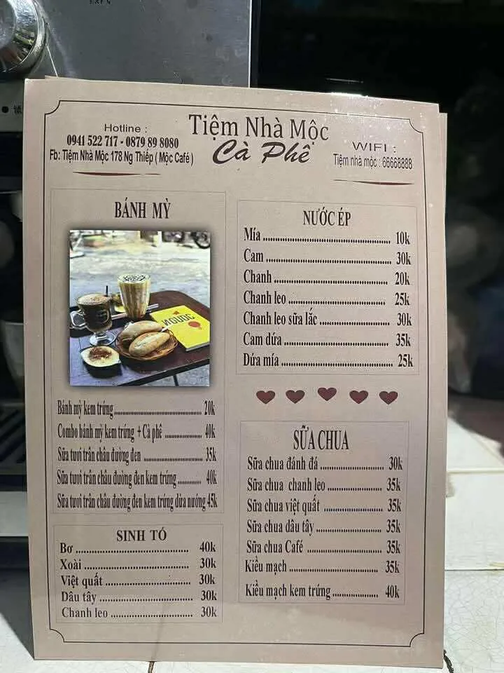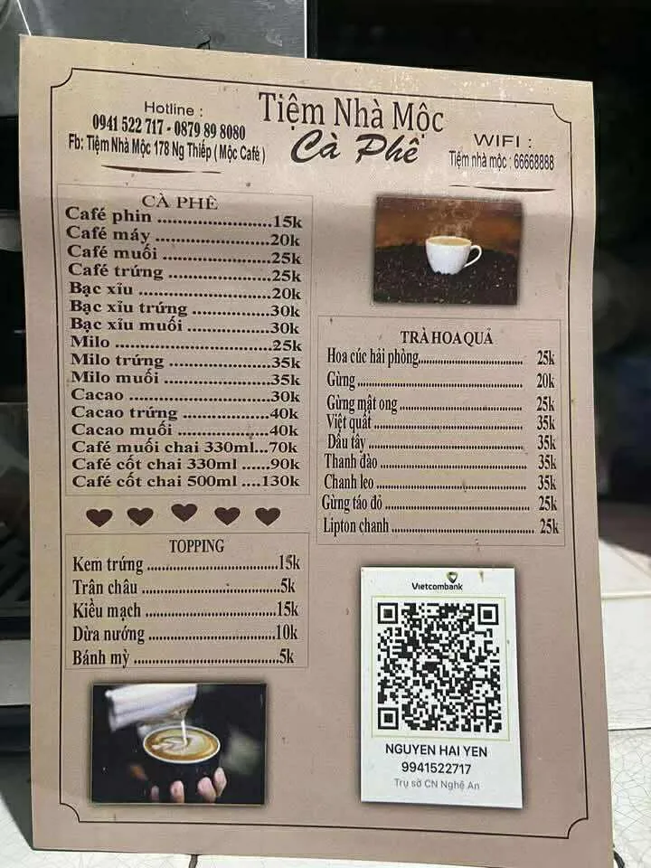Cafe Tiệm nhà Mộc là một quán cà phê được biết đến với phong cách giản dị, mộc mạc và không gian xanh mát. Quán nổi bật các loại đồ uống độc đáo như cà phê kem trứng và cà phê muối, nước ép tươi sạch và các loại đồ ăn vặt, mang đến một địa điểm thư giãn, chuyện trò cho khách hàng tại thành phố Vinh.
