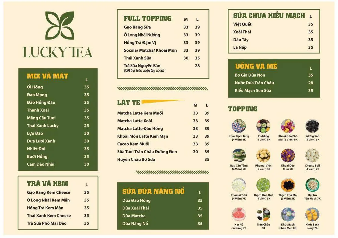 Tiệm trà Lucky là một chuỗi cửa hàng trà và đồ uống nổi tiếng. Thương hiệu này đã từng hoạt động tại nhiều địa điểm, nổi bật với không gian "chill" và đồ uống đa dạng, đặc biệt là các loại trà và matcha.