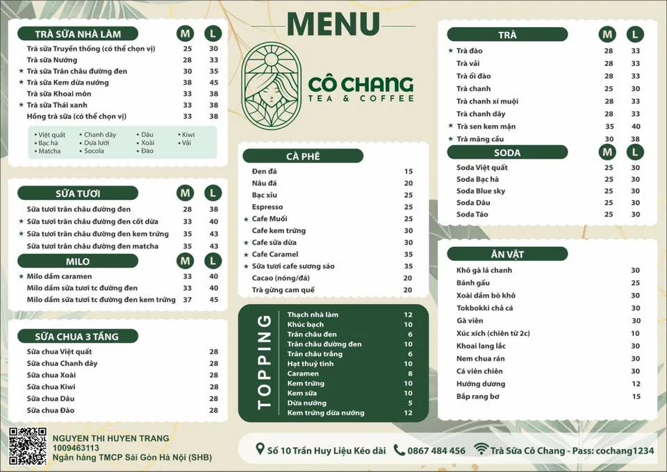 Trà Sữa Cô Chang là thương hiệu lâu năm và là "quán ruột" của nhiều bạn trẻ tại Vinh. Từng rất nổi tiếng tại địa chỉ cũ (Lê Hồng Phong), quán nay đã chuyển về khu vực sau Vinhcentre với không gian "to rộng, thoáng mát hơn nhiều". Nổi tiếng với chất lượng đồ uống thanh mát, "ngon khỏi bàn", Cô Chang còn rất sáng tạo trong việc ra mắt các set quà tặng (hoa và trà) xinh xắn, giá cả hợp lý vào các dịp lễ như 08/03, 20/10.