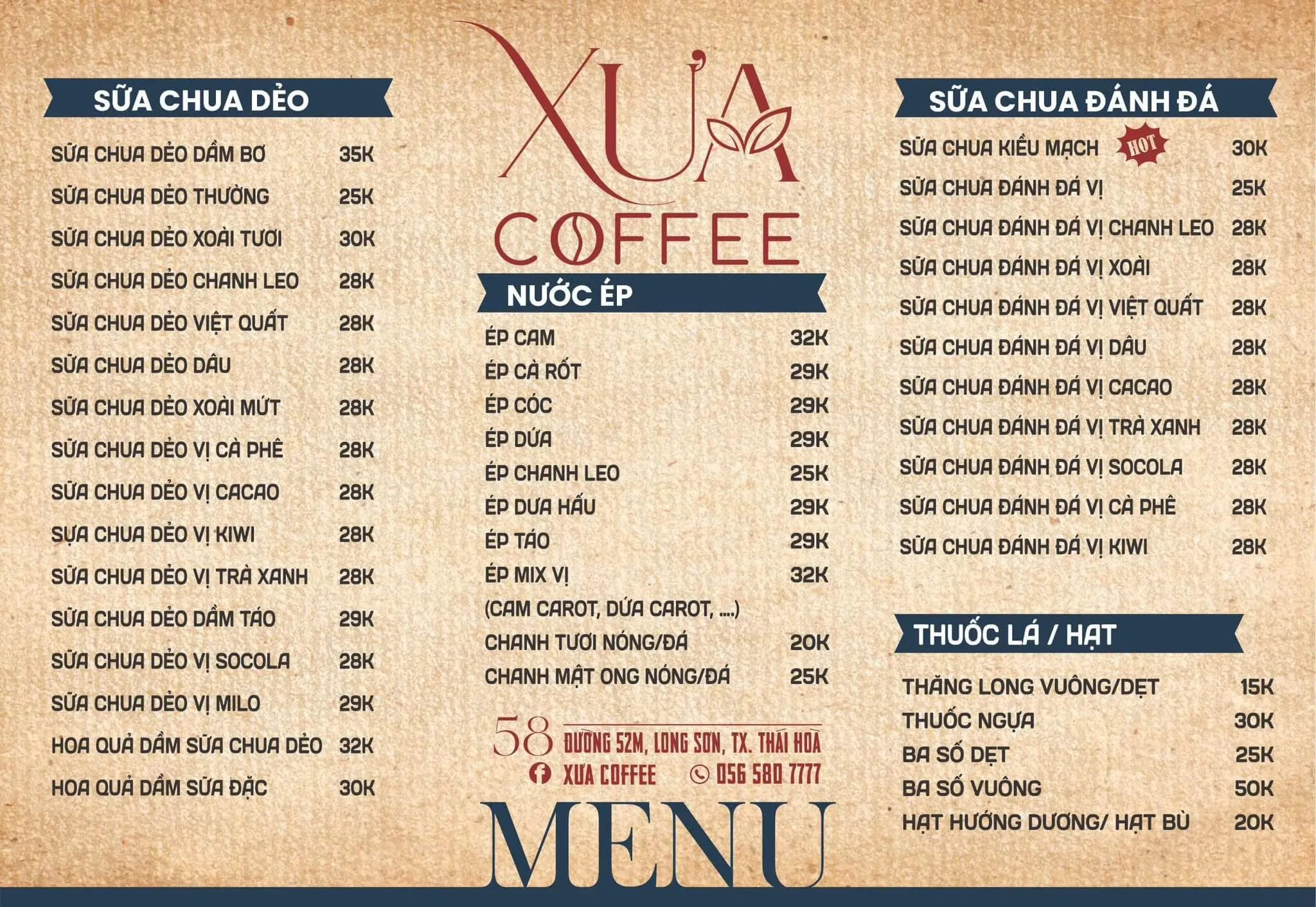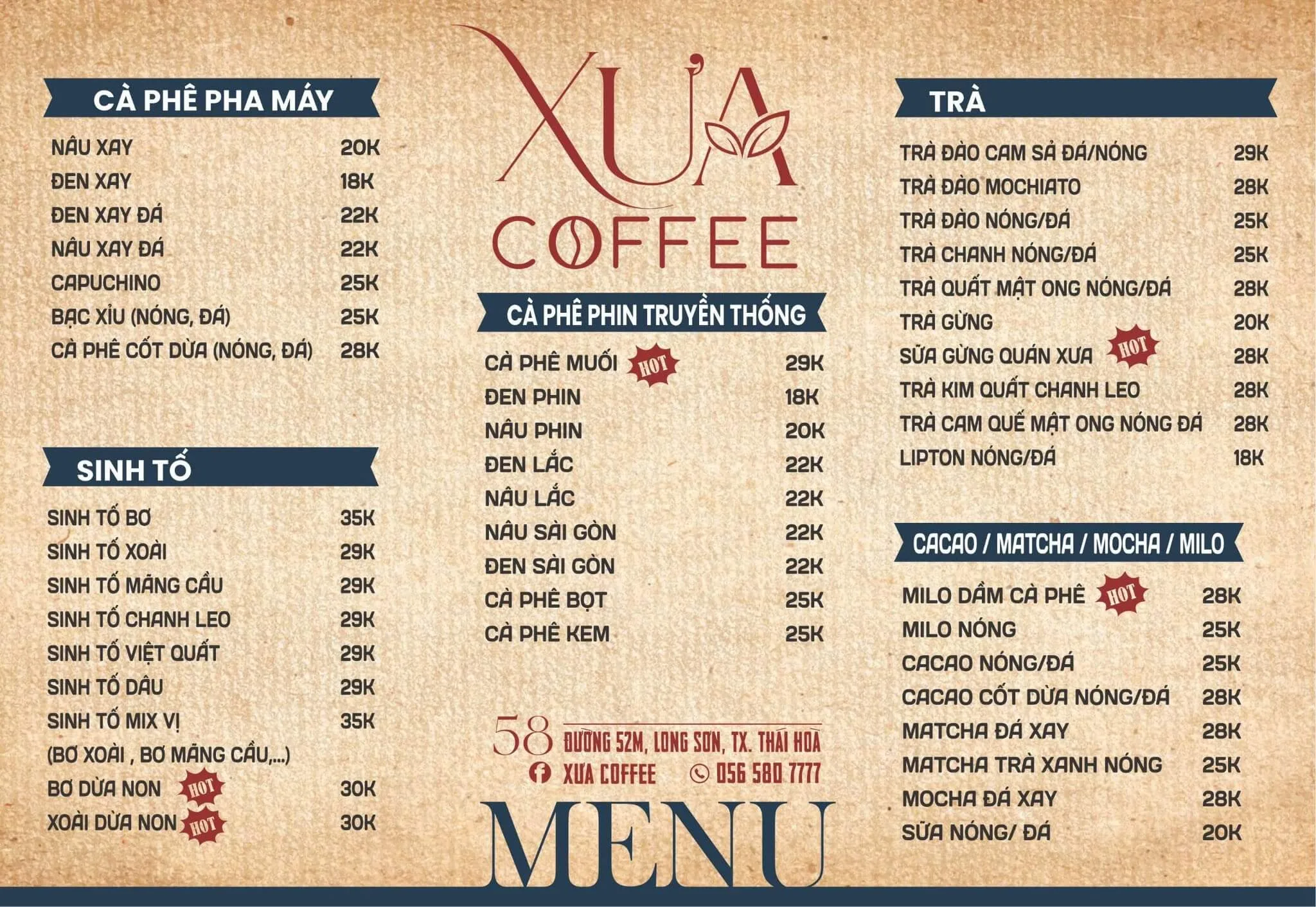 Xưa Coffee là một quán cà phê được nhiều người yêu thích tại Thái Hòa. Tọa lạc tại đường 52m, Xưa Coffee gây ấn tượng với menu đồ uống đa dạng và không gian thư giãn, trở thành điểm đến quen thuộc của nhiều người dân địa phương