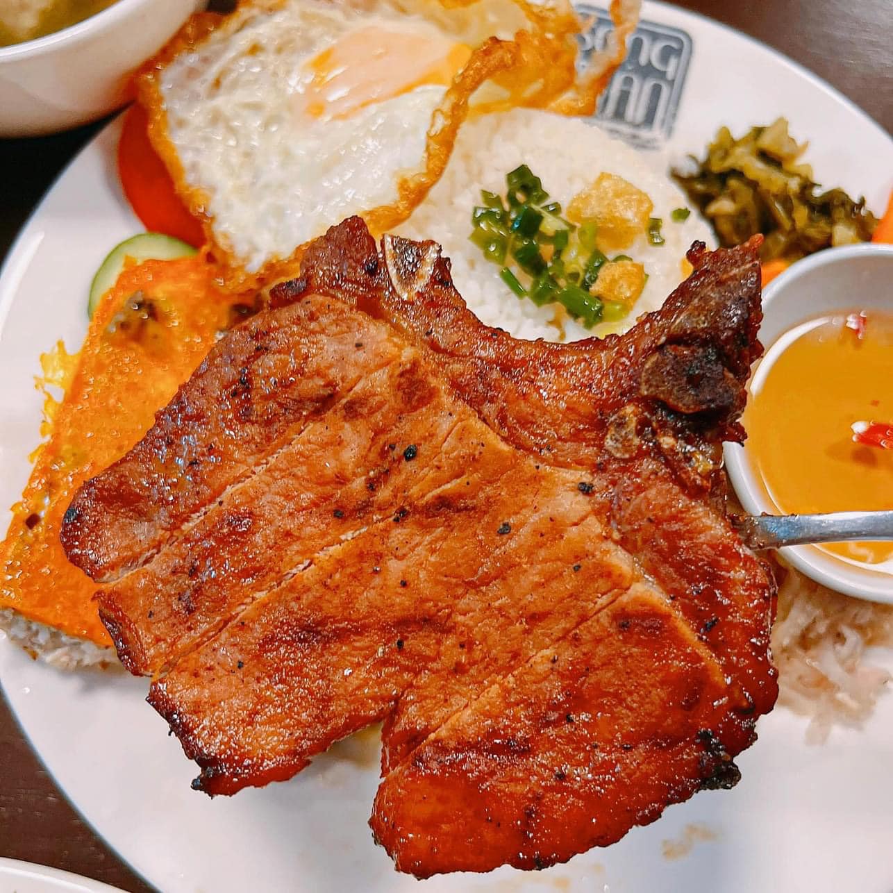 3. Món đặc sắc: Món ăn làm nên tên tuổi của quán chính là Cơm tấm sườn bì chả. Điểm nhấn đặc biệt là miếng sườn cốt lết được tẩm ướp gia vị đậm đà, nướng vàng ươm trên than hồng, giữ được độ mềm ngọt của thịt mà không bị khô.