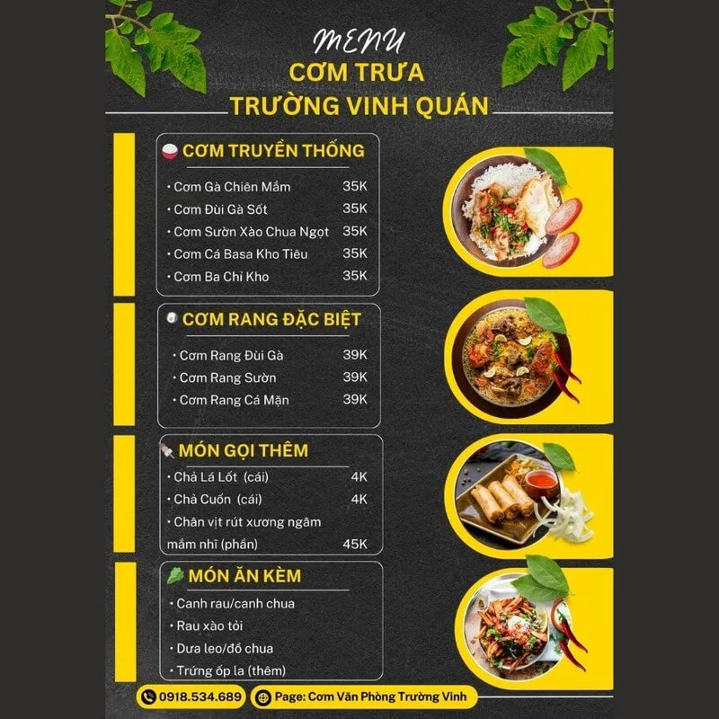 Với tiêu chí "Cơm ngon chuẩn vị, no bụng vui lòng", cơm trưa Trường Vinh Quán là một lựa chọn đáng tin cậy cho mọi người. Nếu bạn đang tìm kiếm một suất cơm nóng hổi, đầy đặn và được giao hàng nhanh chóng, đây chắc chắn là một địa chỉ không thể bỏ qua.