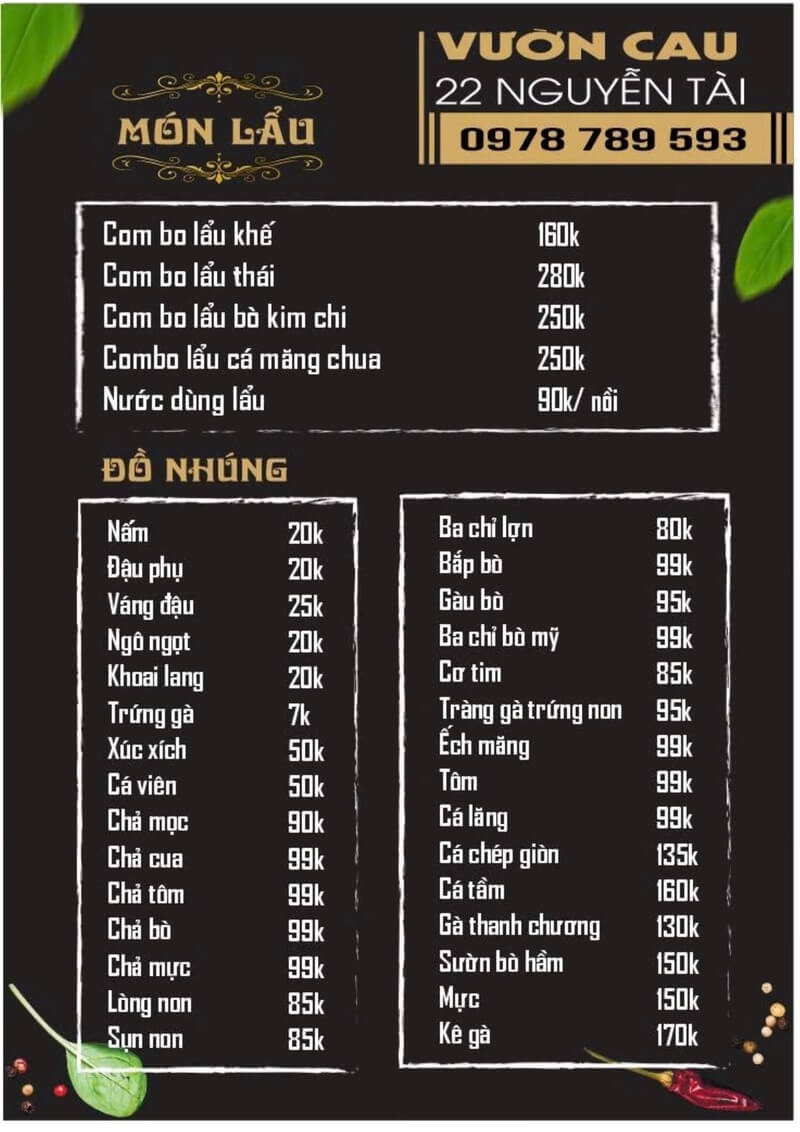 Quán Lẩu khế Vườn Cau tại 22 Nguyễn Tài là sự lựa chọn lý tưởng của các tín đồ mê lẩu. Quán nổi tiếng với món Lẩu Khế chua thanh đặc trưng, cùng một thực đơn lẩu và đồ nhúng cực kỳ đa dạng, tất cả được phục vụ trong một không gian ấm cúng và gần gũi.