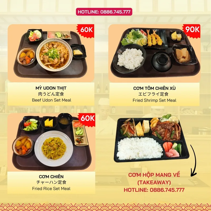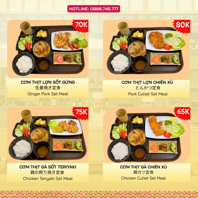 Thực đơn của quán là một danh sách các món ăn tinh hoa của Nhật Bản: