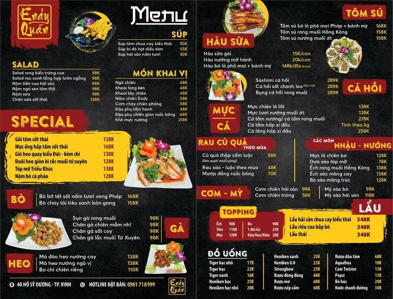 Với sự kết hợp hài hòa giữa không gian thoáng đãng, món ăn phong phú và giá cả hợp lý, Endy Quán là một trong những địa điểm được nhiều người lựa chọn tại Vinh cho các dịp gặp mặt và ăn uống. Nếu bạn đang tìm một quán lẩu nướng dễ tiếp cận, có thực đơn đa dạng và phục vụ chu đáo, Endy Quán là một gợi ý đáng cân nhắc.