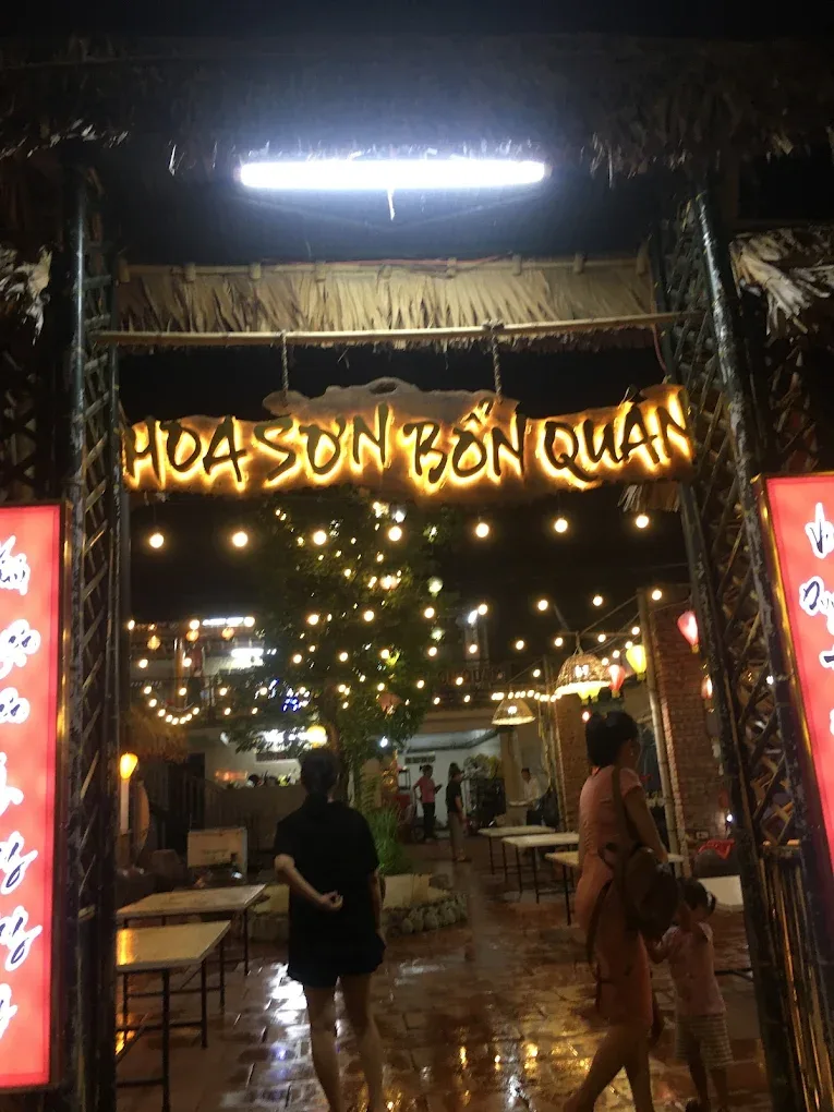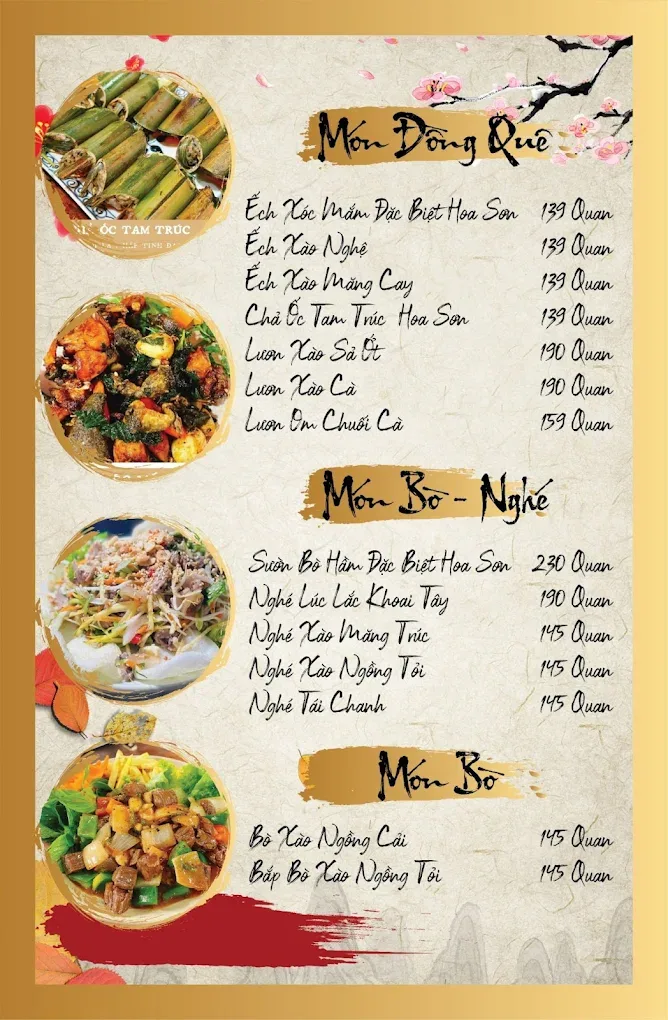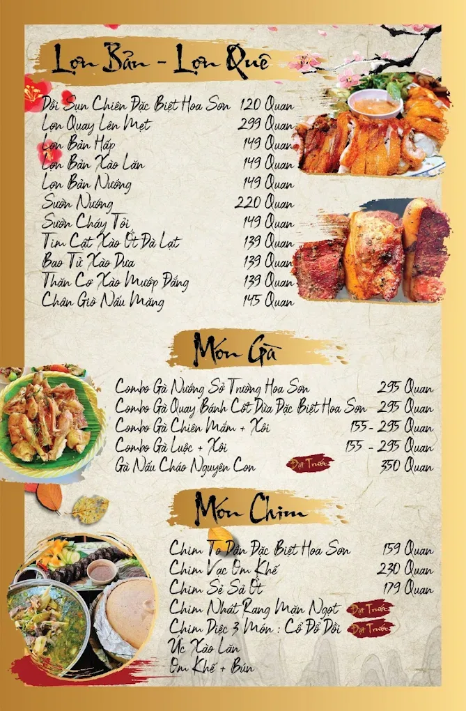 Hoa Sơn Bổn Quán là một điểm đến ẩm thực độc đáo mang phong cách kiếm hiệp, tọa lạc trong một không gian sân vườn rộng rãi và thoáng mát. Nổi tiếng với thực đơn "khủng" trải dài từ các món đặc sản rừng núi đến các món đồng quê dân dã, quán là địa chỉ lý tưởng cho những buổi tụ họp bạn bè, liên hoan công ty và những bữa ăn gia đình thịnh soạn.
