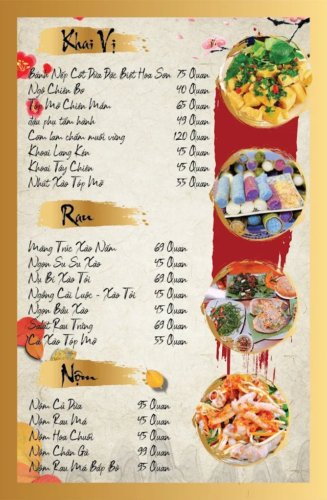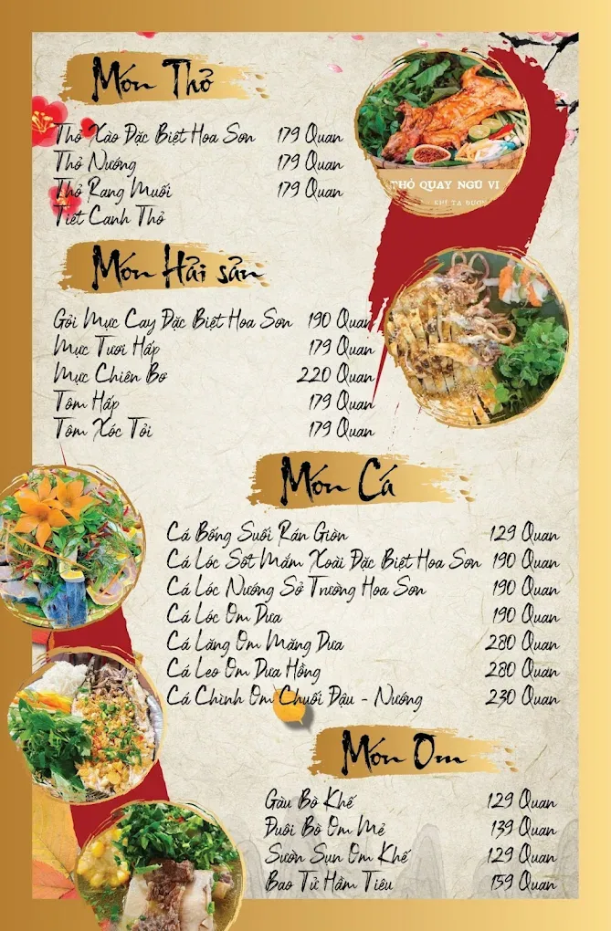 Với một thực đơn "từ trên rừng xuống dưới biển" và một không gian sân vườn độc đáo, Hoa Sơn Bổn Quán là một lựa chọn "ngoài mong đợi" cho những ai tìm kiếm một bữa ăn thịnh soạn. Từ món gà nướng cơm lam lạ miệng đến mẹt cá tràu nướng đầy đặn, tất cả đều hứa hẹn mang đến một trải nghiệm ẩm thực đáng nhớ.