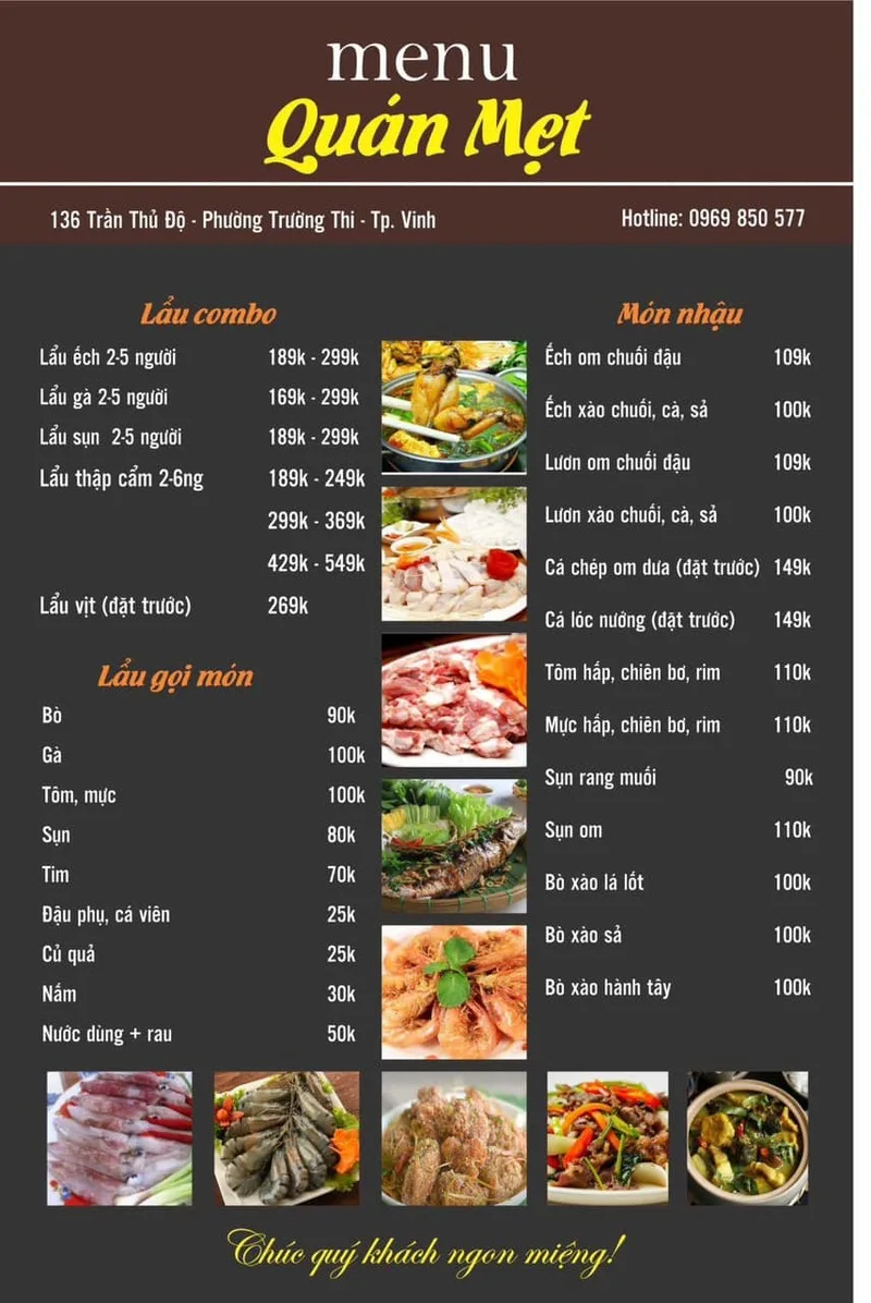 1. Loại hình: Quán ăn/Quán nhậu chuyên món mẹt chuyên về ẩm thực Việt Nam, đặc biệt là các món nhậu, đặc sản đồng quê.