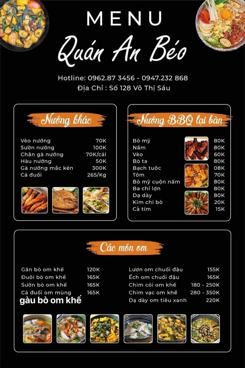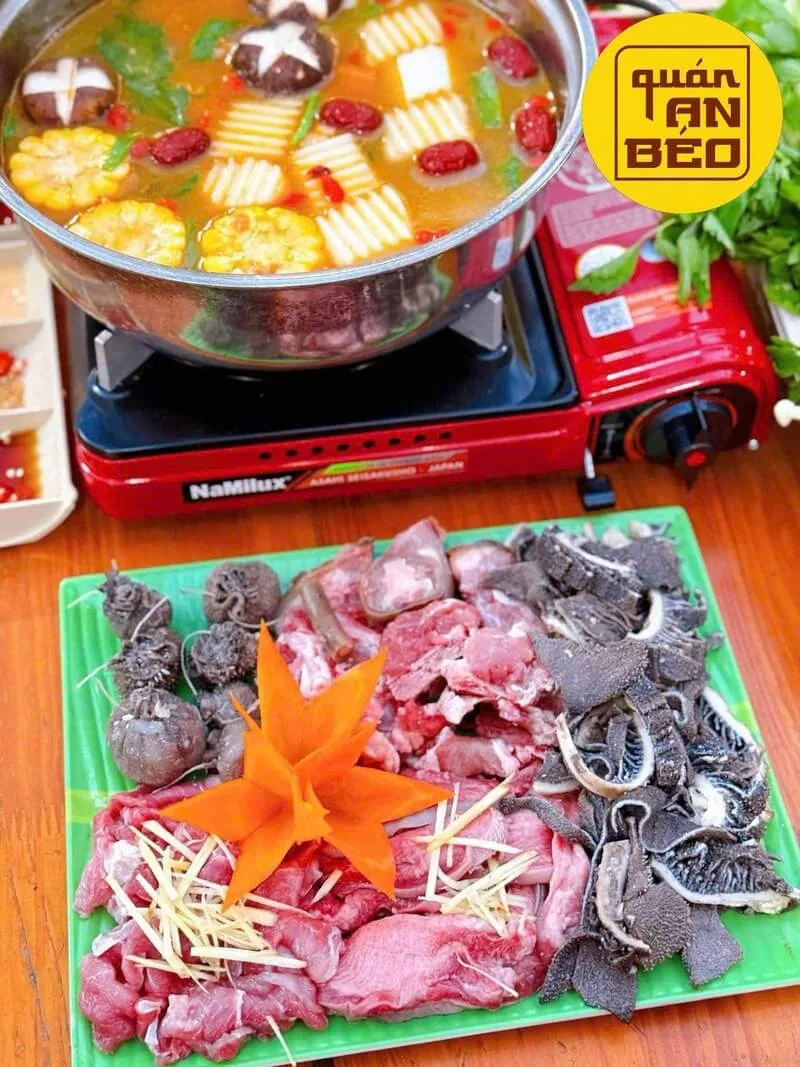 Là một địa chỉ nhậu bình dân nhưng chất lượng "hạng sang", Quán An Béo là điểm đến không thể bỏ lỡ cho các tín đồ mê lẩu và nướng. Quán gây thương nhớ với nồi Lẩu Sườn Bò "siêu to khổng lồ", đầy ắp sườn chất lượng, cùng các món nướng ngói và lẩu bò Mông Cổ độc đáo, tất cả được phục vụ trong một không gian mở rộng rãi.