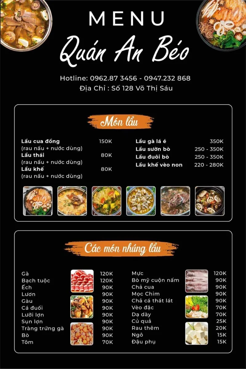 Với chất lượng món ăn vượt trội, đặc biệt là nồi Lẩu Sườn Bò "đã mắt no bụng", Quán An Béo là một lựa chọn cực kỳ đáng tiền cho một bữa ăn thịnh soạn. Nếu bạn đang tìm một nơi có đồ ăn tươi ngon, không gian rộng rãi và giá cả hợp lý, đây chắc chắn là một địa chỉ không thể bỏ qua.