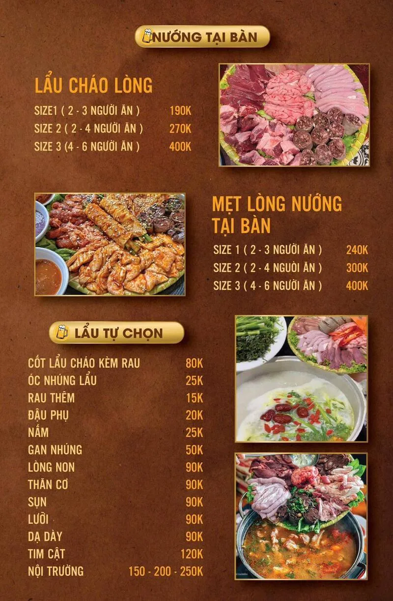 Quán Lòng Thành Vinh tại 33 Nguyễn Sơn gây ấn tượng mạnh với không gian rộng rãi, sạch sẽ và một thực đơn cực kỳ phong phú. Vượt ra ngoài các món luộc truyền thống, quán mang đến nhiều lựa chọn hấp dẫn như mẹt nướng thập cẩm, lẩu cháo và các món chiên, xào đặc sắc.