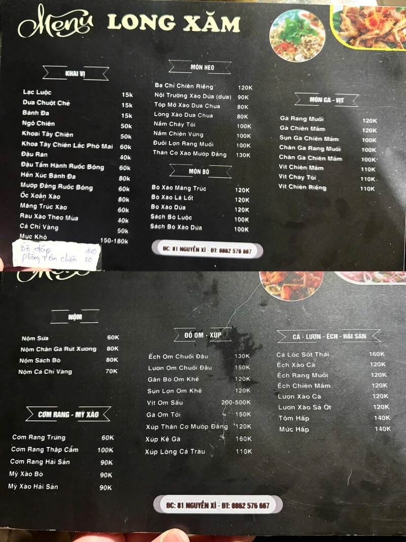 Với lợi thế về thời gian hoạt động xuyên đêm và thực đơn các món nhậu bình dân, đậm vị, Quán Long Xăm là "cứu cánh" hoàn hảo cho những cơn đói đêm hay những cuộc vui chưa tàn. Nếu bạn đang cần một nơi để lai rai tới sáng, đây chắc chắn là một địa chỉ không thể bỏ qua.
