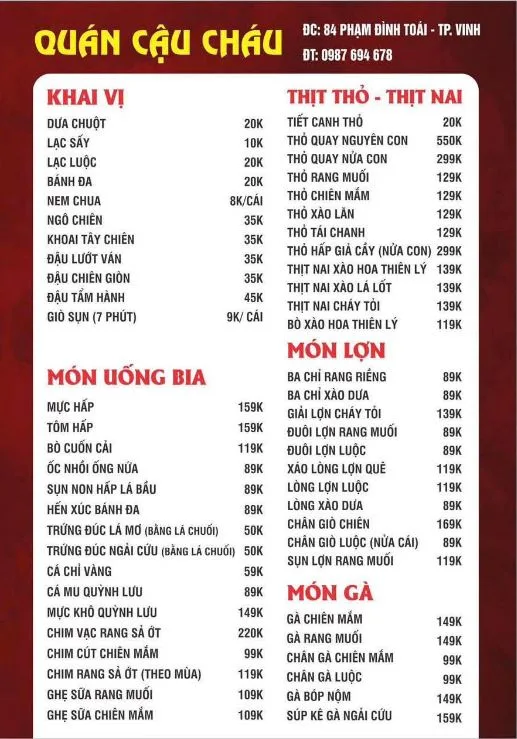 Quán Nhậu Cậu Cháu là một địa điểm quen thuộc tại thành phố Vinh, nổi tiếng với không gian nhậu bình dân, thoải mái và các món ăn đa dạng, giá cả phải chăng. Quán luôn đặt chất lượng món ăn và dịch vụ lên hàng đầu, mang đến sự hài lòng cho khách hàng.