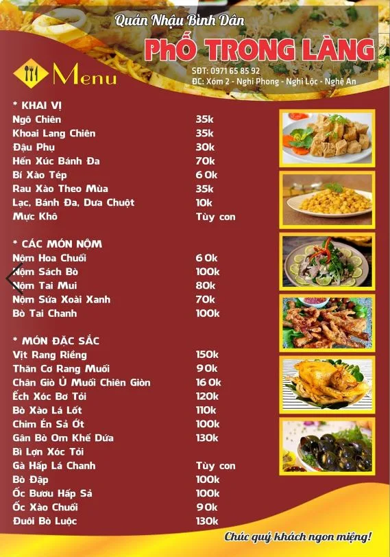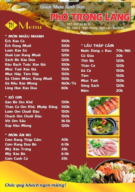 Nhà hàng Phố Trong Làng là một địa điểm quen thuộc để tổ chức các sự kiện quan trọng tại Nghi Lộc. Mặc dù thông tin chi tiết còn hạn chế, nhà hàng được biết đến với dịch vụ tổ chức tiệc cưới, liên hoan và sinh nhật trọn gói, mang đến không gian và dịch vụ phù hợp cho các buổi lễ đặc biệt.