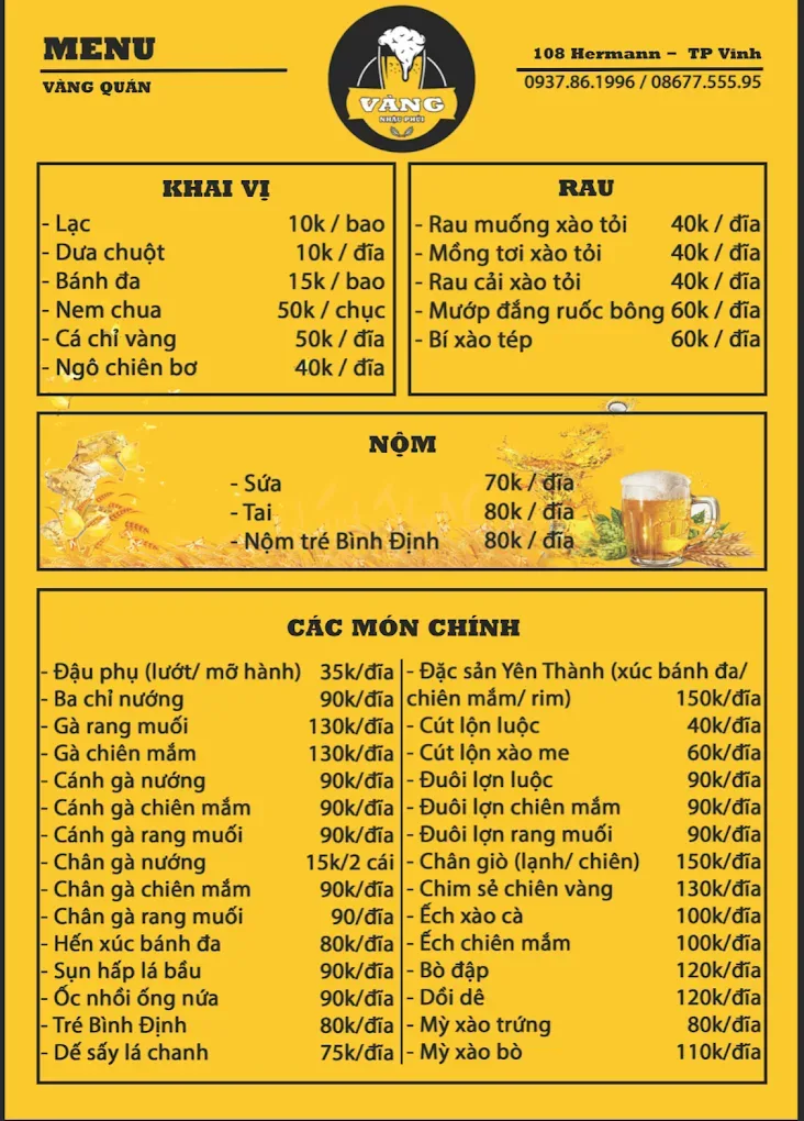 Quán Vàng không chỉ là nơi có bia ngon, mồi bén mà còn là nơi thực khách cảm thấy thật sự gần gũi và thoải mái. Với chất lượng bia hơi đỉnh cao, thực đơn nhậu phong phú và đặc biệt là sự nhiệt tình hiếm có, đây chắc chắn là một địa chỉ "ruột" mà bạn sẽ muốn quay lại thường xuyên.