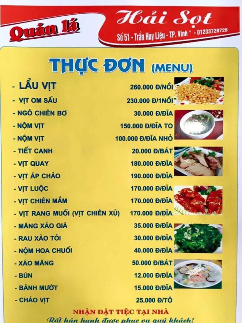 Tọa lạc trên con đường Trần Huy Liệu, Nhà hàng Vịt Hải Sọt từ lâu đã trở thành một điểm đến quen thuộc và được yêu thích của người dân thành Vinh và du khách khi muốn thưởng thức các món ăn đặc sắc từ vịt.