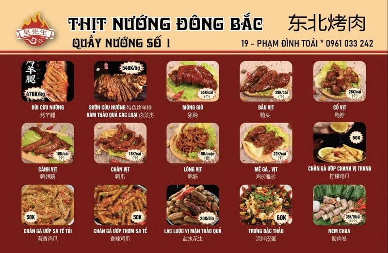 Thực đơn của quán là một danh sách các món nướng và ăn kèm chuẩn vị Trung Hoa: